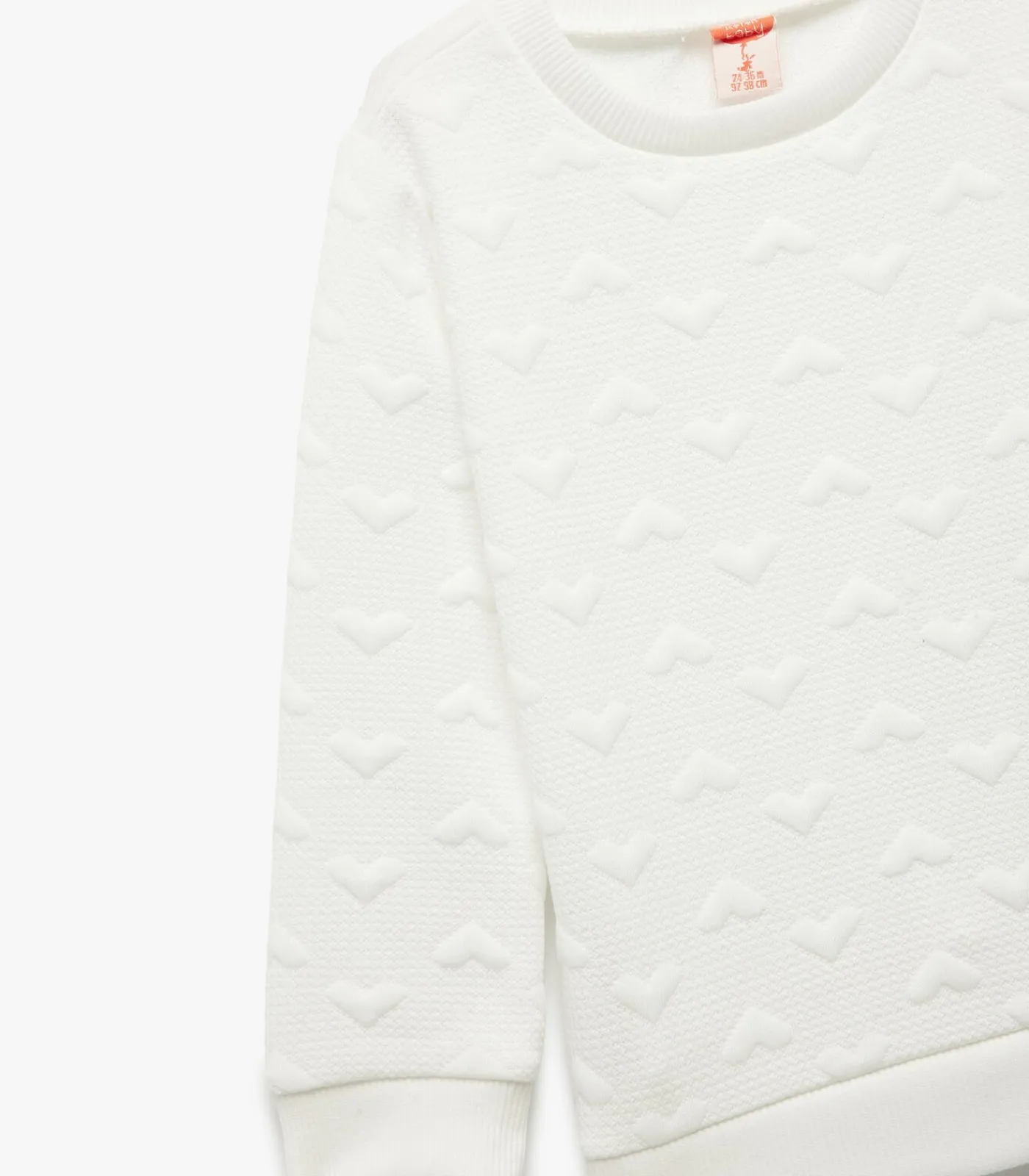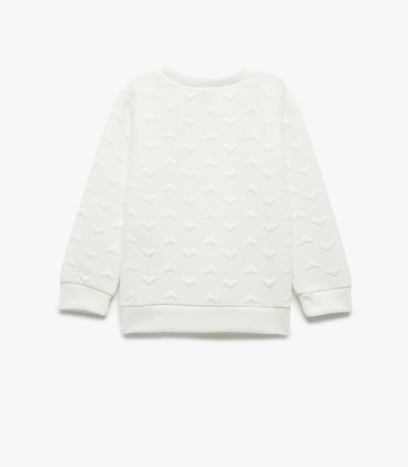 Deze crèmekleurige meisjestrui combineert comfort en stijl dankzij het schattige hartjes jacquardpatroon. Met de ronde hals en lange mouwen biedt het optimale bewegingsvrijheid voor speelse dagen. Perfect voor zowel binnen als buiten dragen, dankzij het zachte en rekbare materiaal dat de hele dag comfortabel aanvoelt. Voeg een vleugje schattigheid toe aan de garderobe van je kind met deze tijdloze trui.