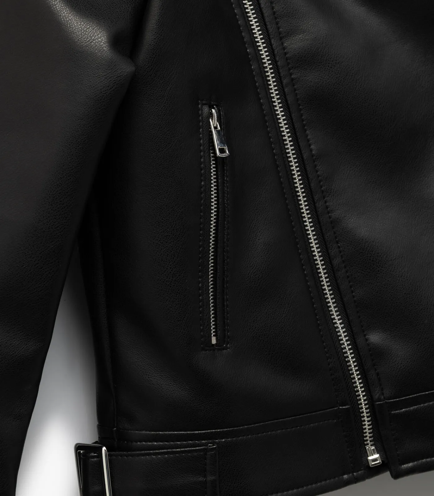 Geef je kind een stoere en moderne look met deze zwarte biker jas van kunstleer. De jas is voorzien van een kruiskraag en lange mouwen, en biedt praktische zakken met ritsen. Ideaal voor dagelijks gebruik of speciale gelegenheden, deze jas combineert stijl en comfort voor elk seizoen.