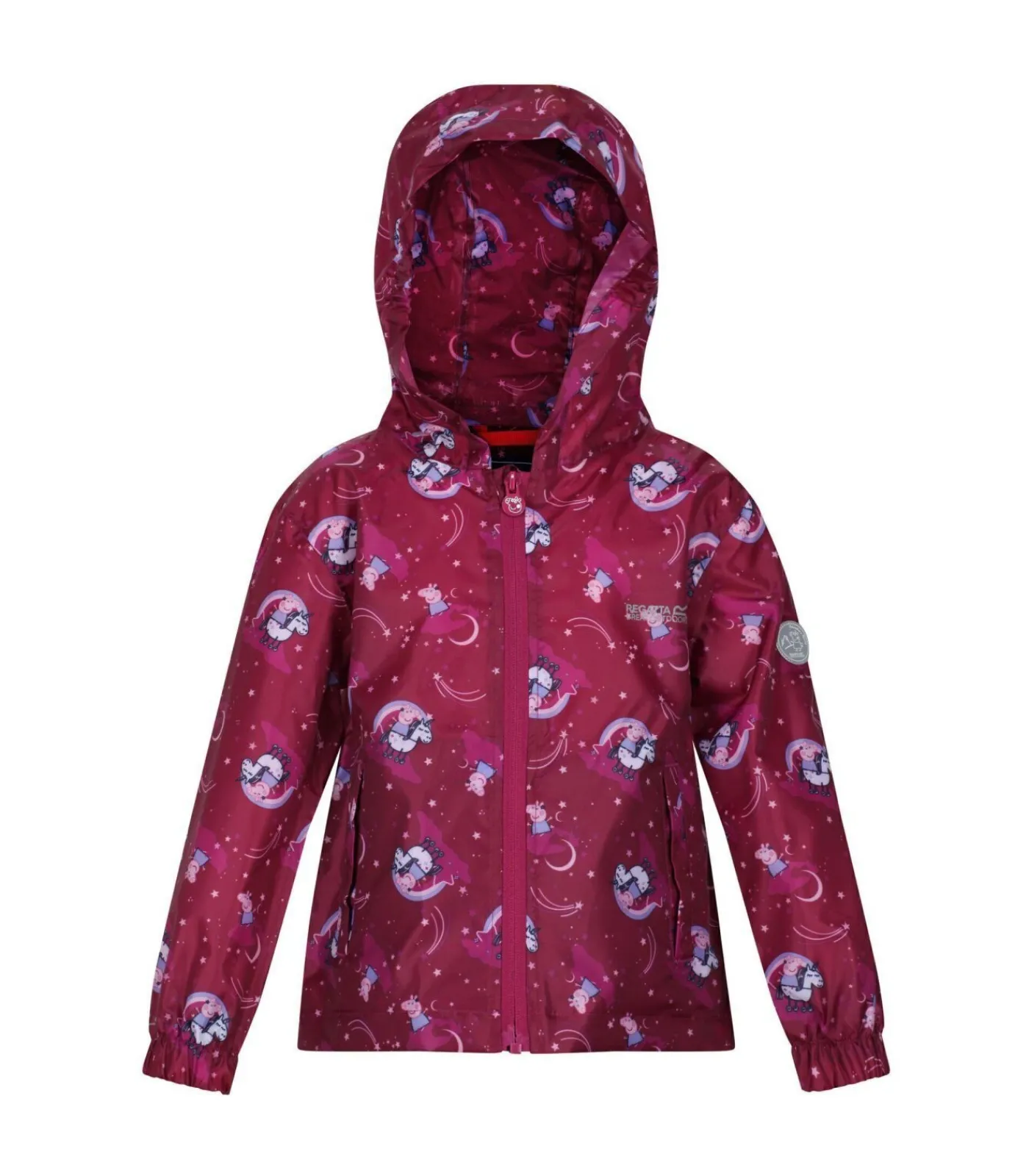 Deze kinderjas van Regatta is ontworpen met Peppa Pig–figuren. Het is gemaakt van 100% polyester stof met een Isolite en polyamide mix waardoor het ademend, duurzaam, waterafstotend en waterdicht is. De naden zijn getapet voor extra bescherming tegen de elementen. Het ontwerp met capuchon heeft een elastische, vastgegroeide capuchon voor bedekking en comfort. Er zijn twee zakken onderaan voor opbergruimte. De rits sluit. De jas is packaway voor compact opbergen en voldoet aan de waterdichtheidseisen van 5000g/m2/24hrs.