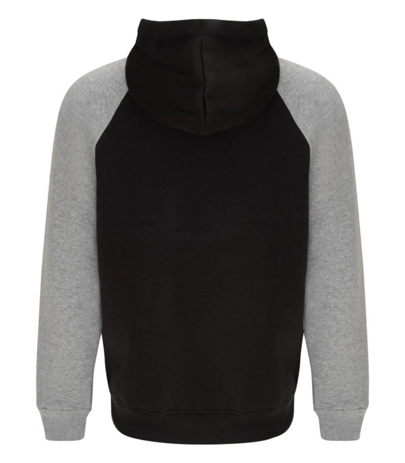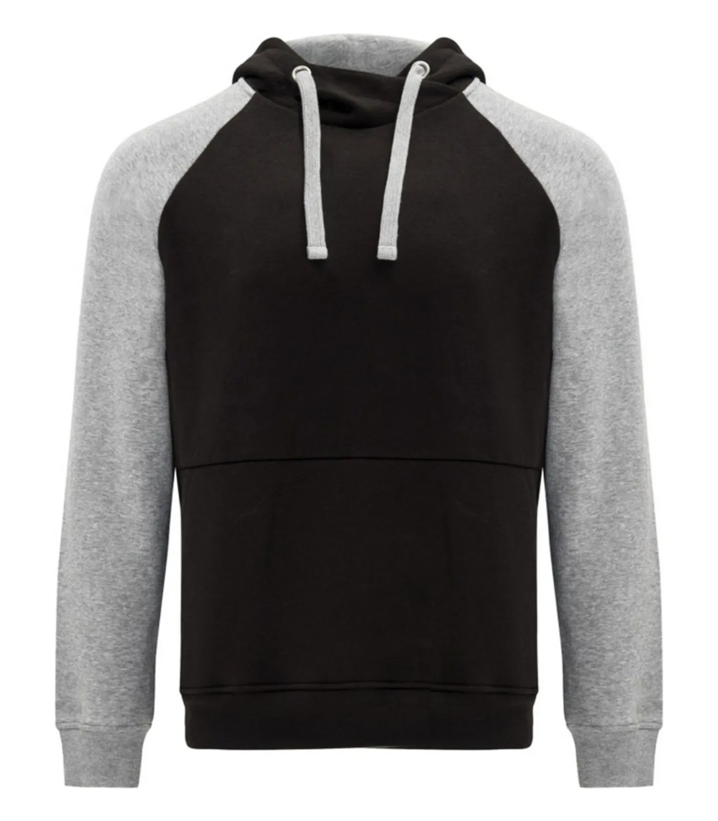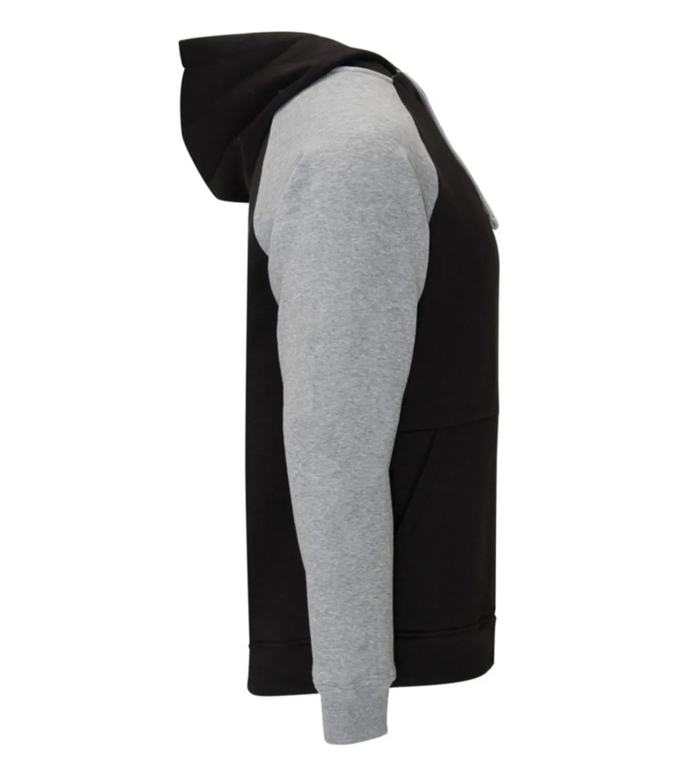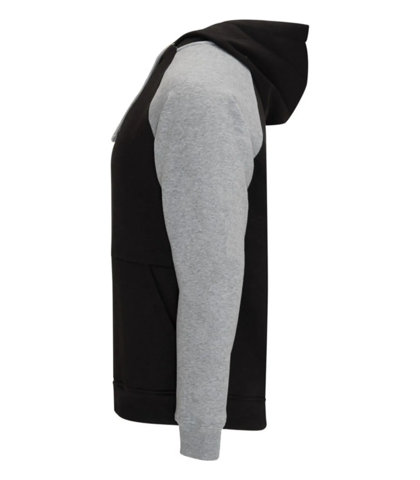 Het product in kwestie is een kinderhoodie met een tweekleurig ontwerp. Het heeft een capuchon met trekkoord en een aangenaaide constructie. De zoom en manchetten zijn geribd en gemaakt met elastaan voor een goede comfortabele pasvorm. De halslijn heeft een gekruiste stijl met een capuchon en metalen oogjes voor ventilatie. Er is een afscheurlabel aanwezig om het na aankoop gemakkelijk te verwijderen. De hoodie heeft lange raglanmouwen en een enkele kangoeroezak aan de voorkant. Het is ontworpen als pullover zonder rits– of knoopsluiting.