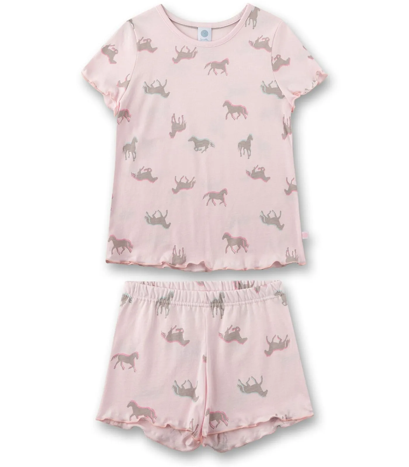 Korte pyjamaset voor meisjes van het merk Sanetta. Top en shorts met korte mouwen, all–over print, single jersey van aangenaam zacht biologisch katoen.