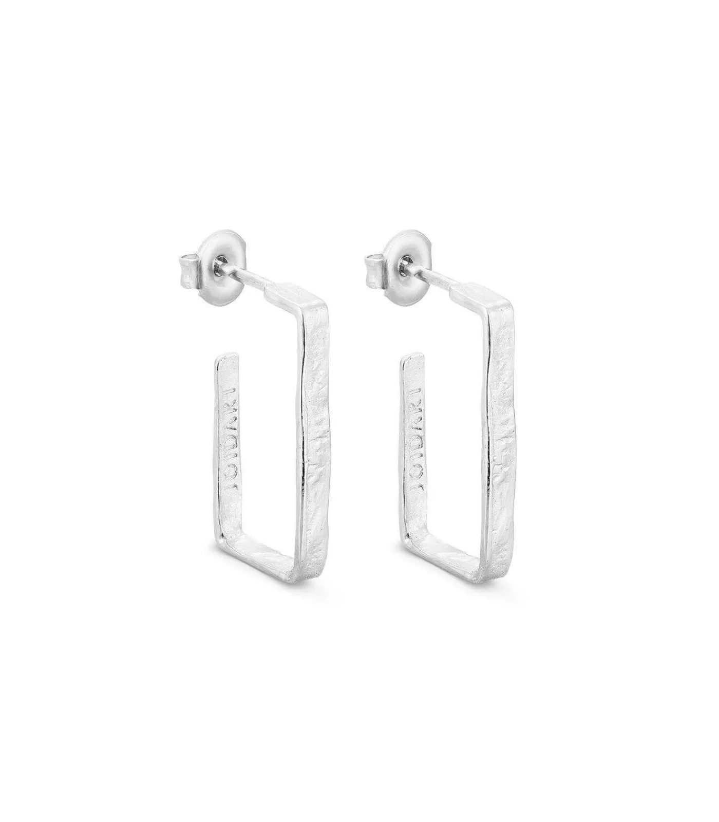 Middelgrote, rechthoekige oorbellen van mat glanzend 925 zilver met een platina coating. Smal ontwerp met texturen die doen denken aan de schors van sommige mediterrane bomen. Vlindersluiting.