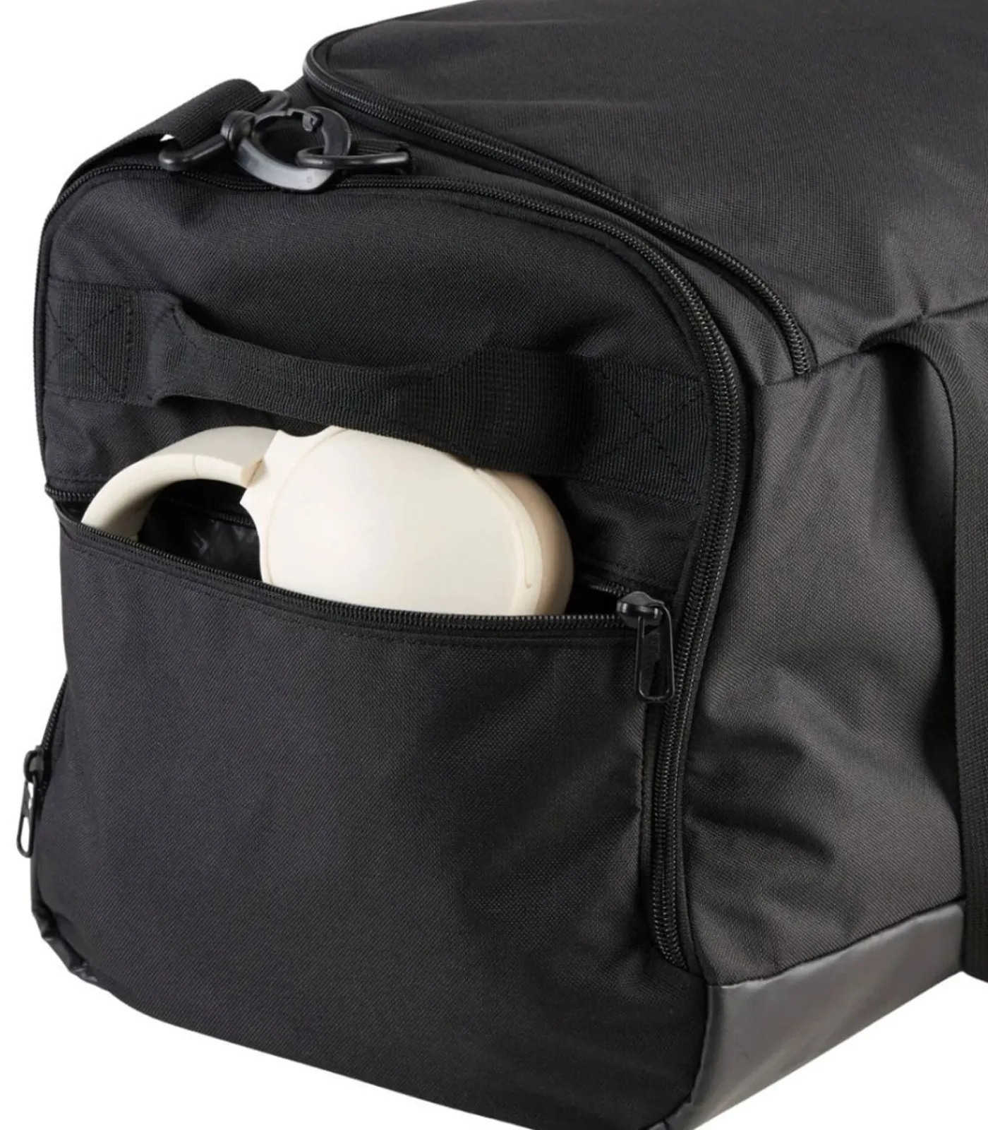 Puma’s zwarte Challenger–plunjezak is gemaakt van 100% polyester en telt een lengte van 62 cm, een hoogte van 31 cm en een breedte van 29 cm. De zak heeft onder meer verstelbare schouderriem, handvat, klittenband en gevoerde bodem. Verder bevat deze plunjezak PU–inzetstukken, schoenenvak en soft touch. De zak wordt vastgehouden door een tweewegrits. Het ontwerp is contrastlogogeborduurd en glad. Deze zwarte plunjezak biedt één hoofdcompartiment en drie zakken: zijzak, rijssluiting en meshzak. De inhoud bedraagt 58 liter en de zak is gemaakt van hergebruikt materiaal.