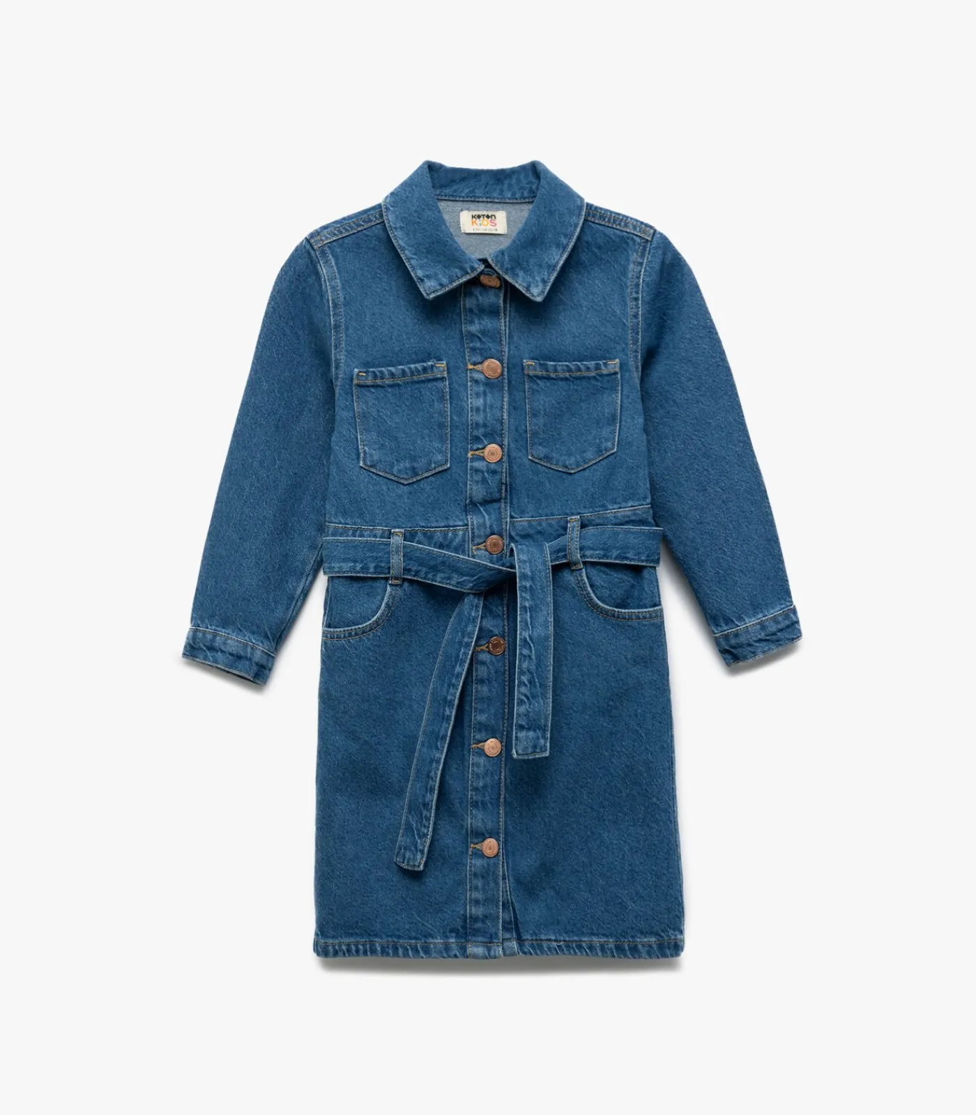Deze denim jurk voor meisjes biedt een perfecte combinatie van stijl en functionaliteit. Met een ceintuur dat de taille subtiel accentueert, is deze jurk zowel trendy als praktisch dankzij de zakdetails. Gemaakt van 100% katoen, zorgt het voor comfort en duurzaamheid. Dit is het ideale kledingstuk voor iedere gelegenheid, in elk seizoen.