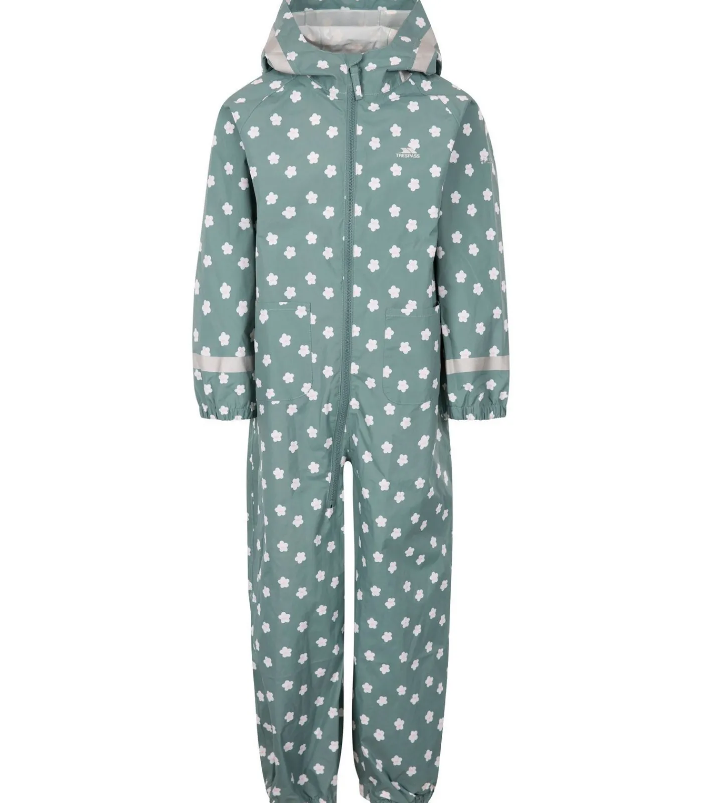 Trespass Showery – Regenpak Lichtgroen is een waterdichte en winddichte regenjas met all–over print van bloemen en het logo van de merk. Deze jas wordt gemaakt van 100% polyester met PVC–coating, en heeft elastische manchets en enkels met reflecterende bandjes voor meer veiligheid op de weg. De halslijn is uitgerust met een kapitein om het bijpassen makkelijker te maken. De jas heeft twee zakken, die gesloten kunnen worden met een trekkoord of ritssluiting. De waterdichtheid van de jas bedraagt 2000mm en is geschikt voor gebruik in het regenseizoen. Bij gebruik van deze jas wordt aangeraden om de lengte over de tijd te laten groeien, omdat dit de comfort verbetert. De jas behoort bij personen tussen 2–3 jaar met een lichaamslengte van 21 in, personen tussen 3–4 jaar met een lichaamslengte van 22 in en personen tussen 5–6 jaar met een lichaamslengte van 24 in.