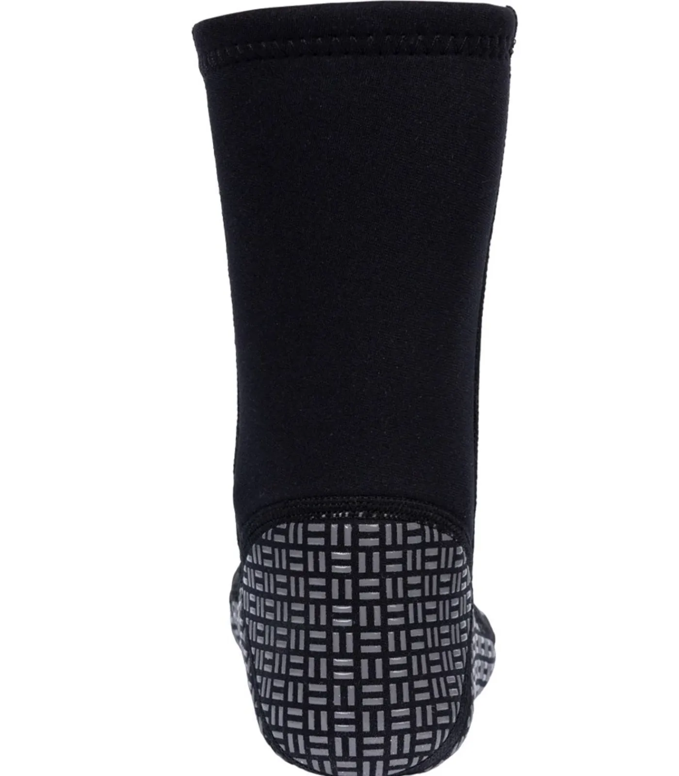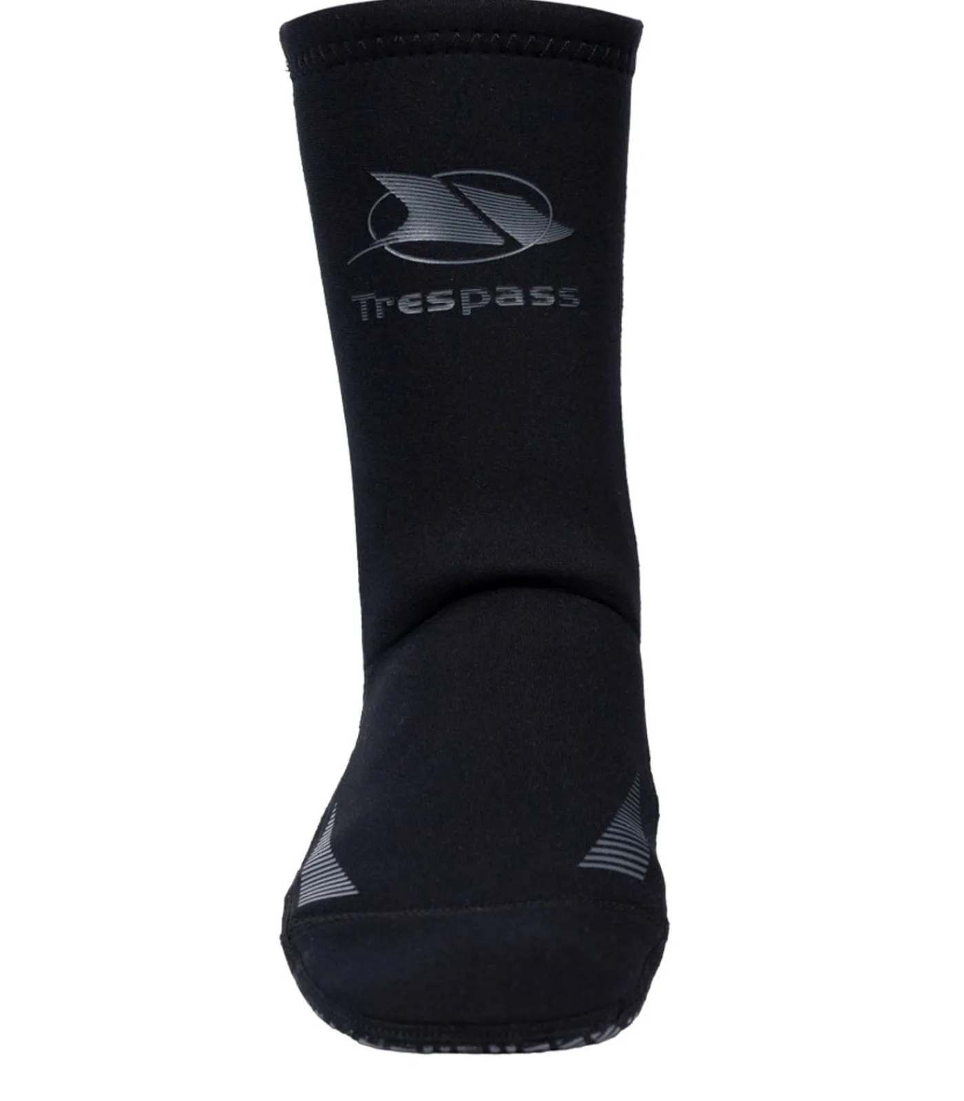 Trespass YOLY – Zwarte Sokken met neopreen en polyamide–materiaal en siliconen greep. Deze zeilzieke zwarte sokken hebben een breidbare, gebreide schuimstof, en zijn ontworpen met het Trespass logo. Het wetsuit is 3mm dik. De voeten worden vastgehouden door een siliconen greep.