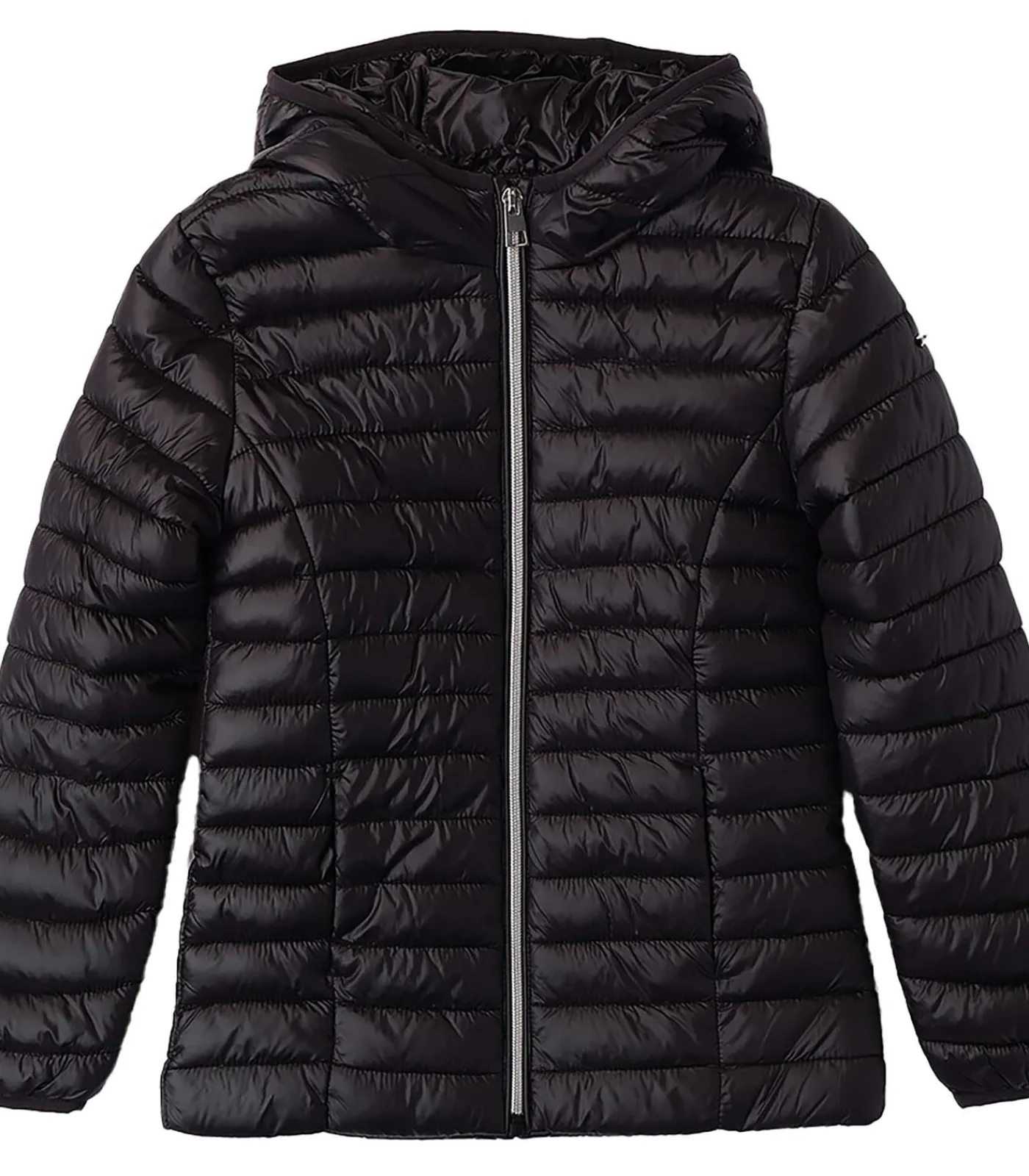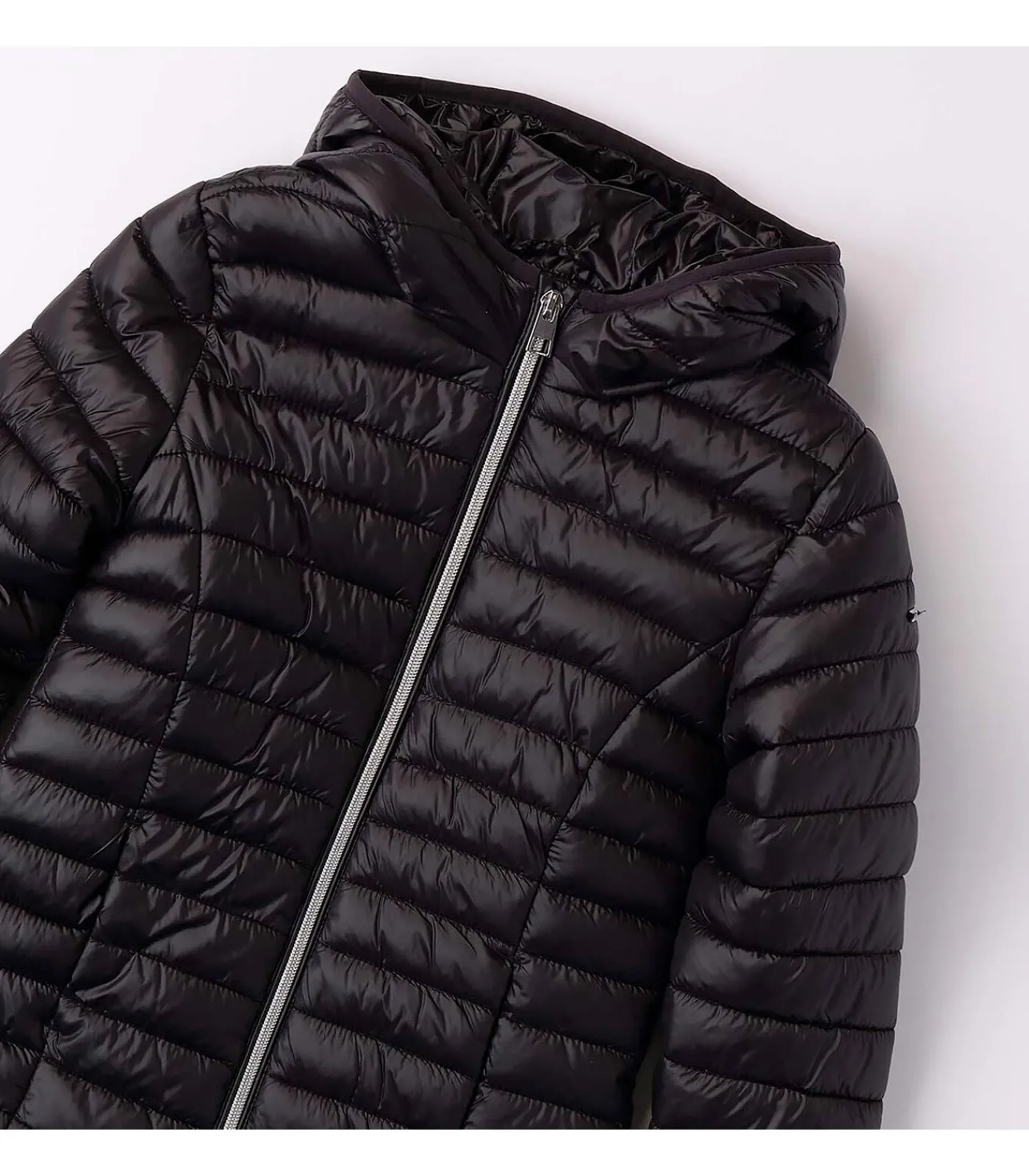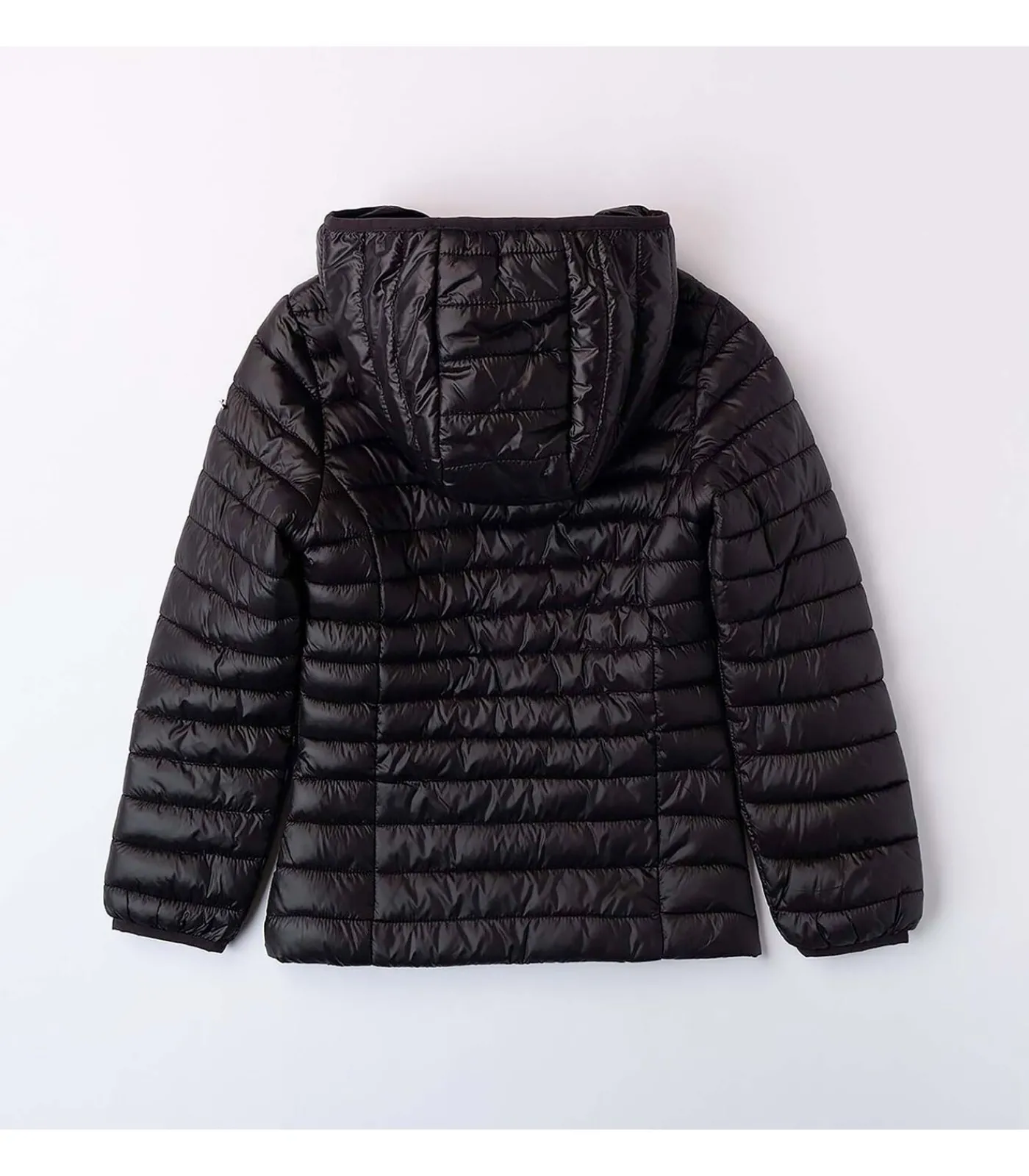 Kleur: zwart. Samenstelling: nylon. Mouwen: lang. Sluiting: rits aan de voorkant. Capuchon: vast. Details: iDO gewatteerde jas voor 8–16 jaar, gemaakt van thermisch materiaal met horizontale stiksels, ontworpen voor warmte en comfort op koude dagen. Gebruik: perfect voor school, vrije tijd en dagelijkse activiteiten in de winter.