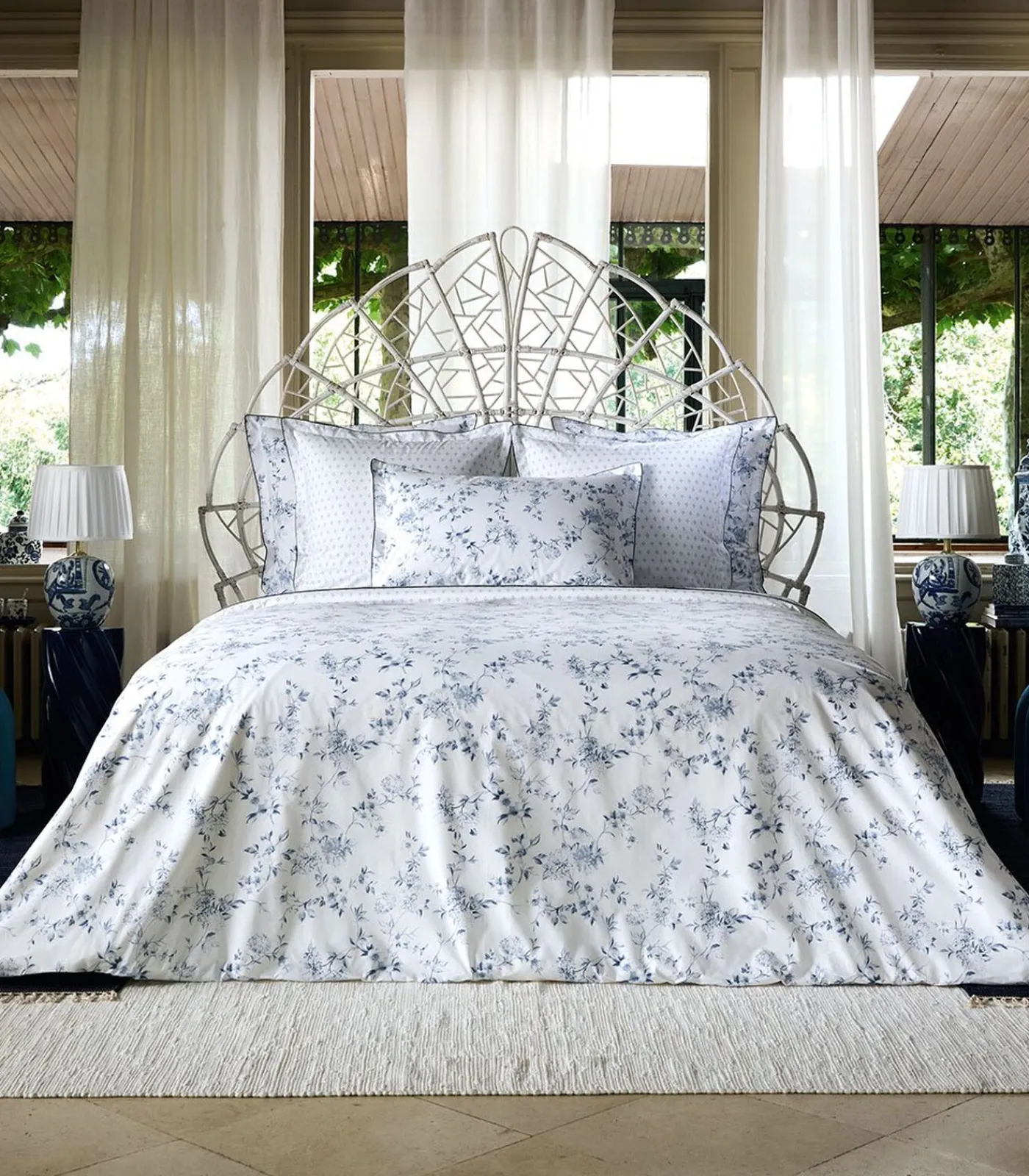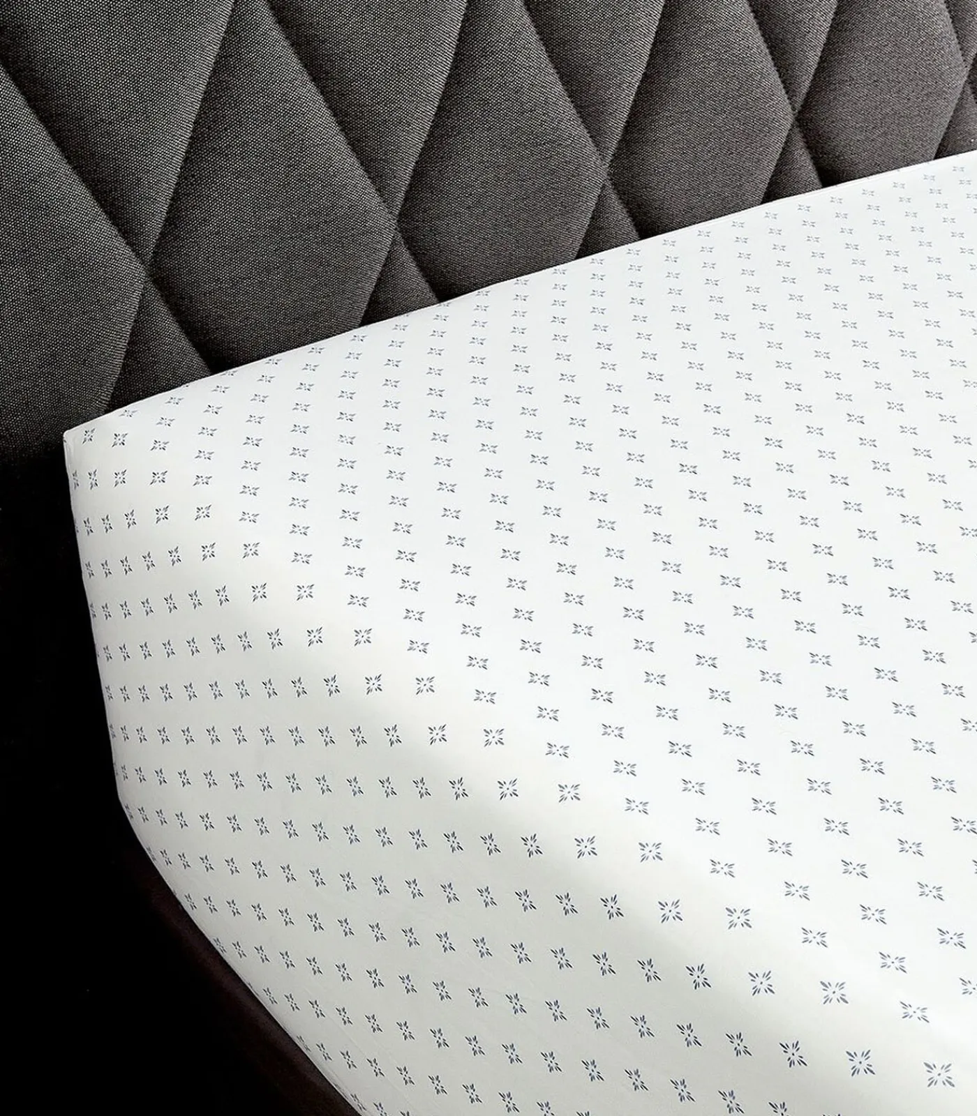 Blauwe faïenceprint op optisch witte achtergrondHoeslaken met een hoogte van 35 cm