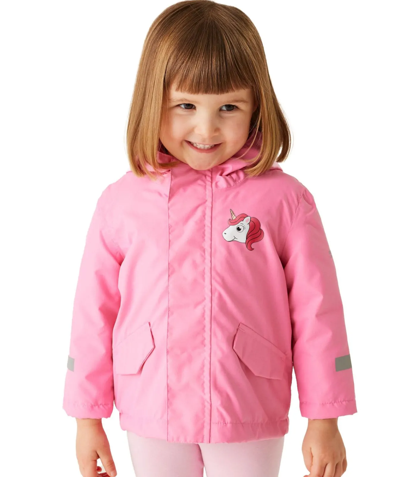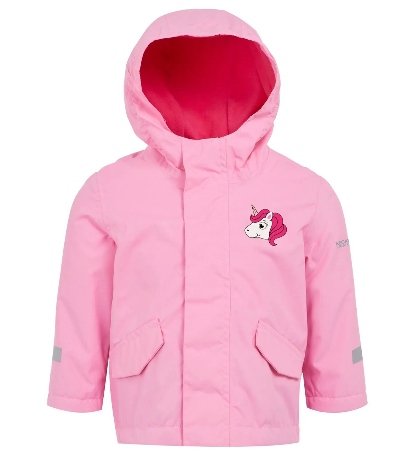 Regatta LUNA THE UNICORN roze jasje heeft een polyester–voering, waarbij de sierlijn en het logo zijn versierd met unicornenmotieven. Deze jackoonstoffen hebben taffeta–opvulling. Het kostuum vertoont een aantal technologische stoffuncties waaronder ademend, duurzaam, DWR–eindbehandeling, isolerend, Isotex 10000, lichtgewicht, sneldrogend, Thermo Guard, waterdicht en winddicht. Deze jackoonstoffen hebben een reflectieve eigenschap van 360 graden en gespreide naadverbindingen. Er is een kapiteinshalslijn, langarm, een groeiende kap, peak en twee zakken met kapsluiting. Het jasje heeft een volledige rits, haak en lus, stormflap sluitingsmechanisme. De waterafstottingswaarde is 10000g/m²/24hrs en het grootte–indeling is 4–5 jaar grootte 22 in.