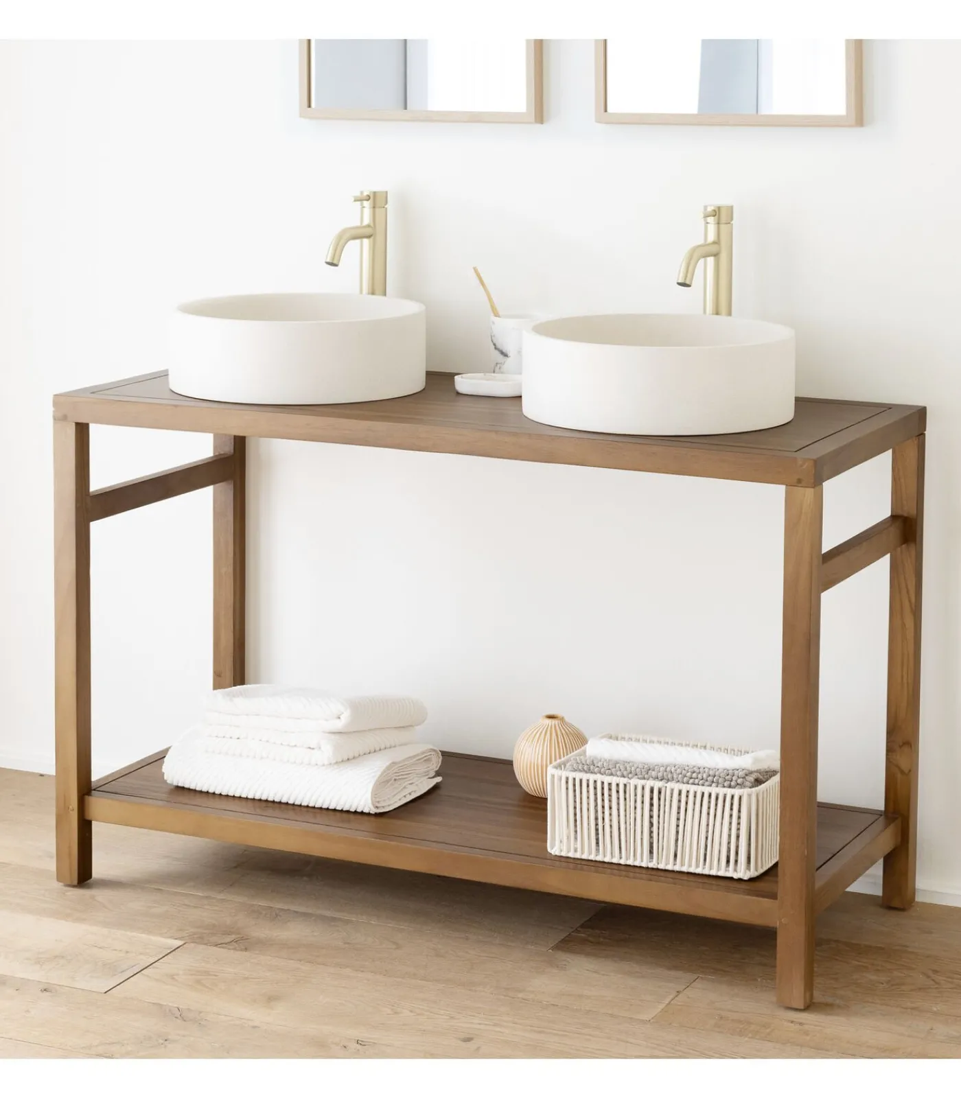 Met een breedte van 120 cm biedt dit meubel genoeg ruimte voor een dubbele wastafel en extra opbergruimte. Licht teakhout geeft je badkamer een warme, natuurlijke uitstraling. De matte afwerking behoudt de ruwe look van het hout en voelt tegelijkertijd zacht aan. Het is praktisch en gemakkelijk te integreren, en dus net zo geschikt voor grote badkamers als voor meer minimalistische omgevingen. Robuust en vochtbestendig, teak is perfect voor dagelijks gebruik.
