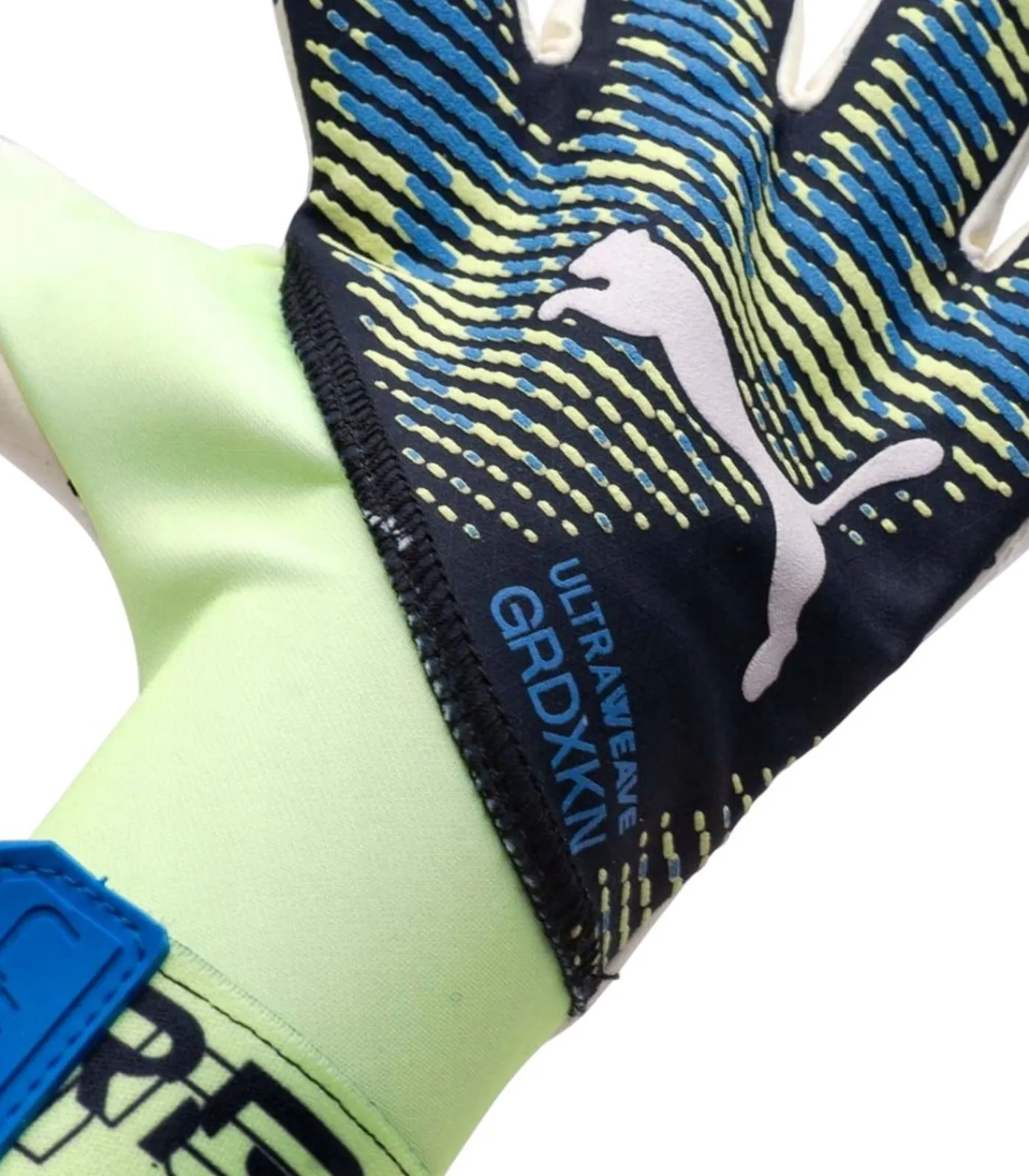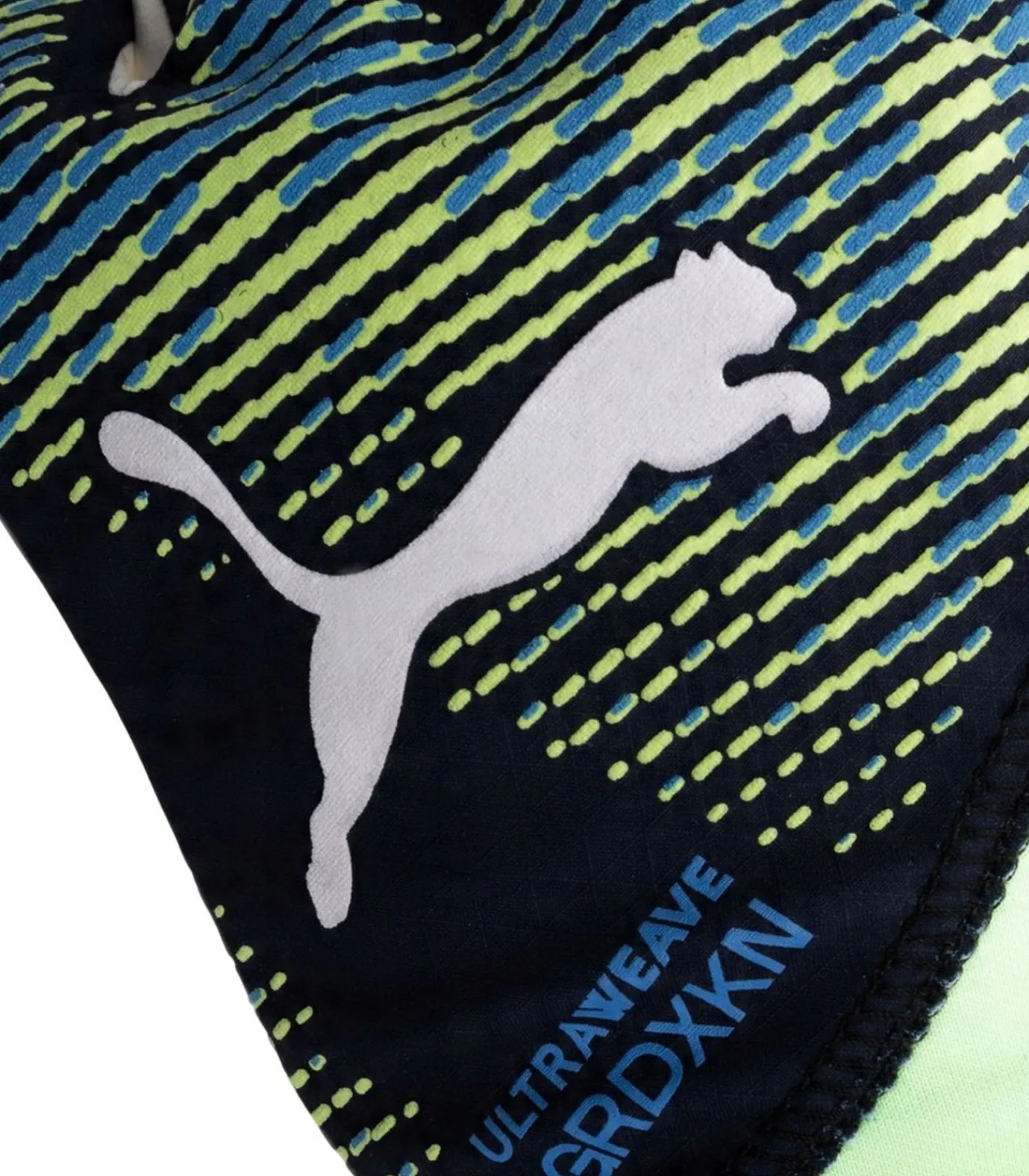 Puma Ultra Ultimate 1 handschoenen in citrusgeel met een samenstelling van 55% polyester, 44% latex en 1% polyurethaan. De materialen worden gebruikt om een 4–Way Stretch stof te verkrijgen, die lichtgewicht is. De palm bestaat uit 4mm latex met grips, negative cut en Twin Wrap Technologie. De handschoenen worden aan de hand van een aanrakingsbevestigingsband vastgemaakt.