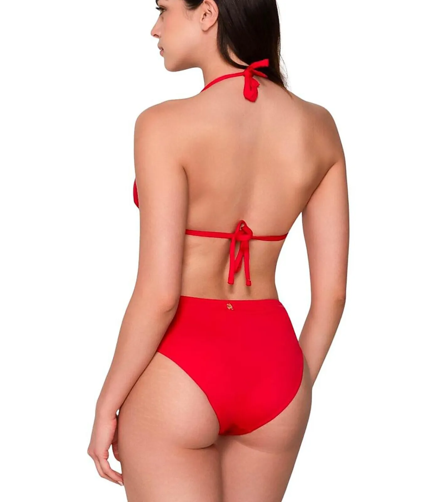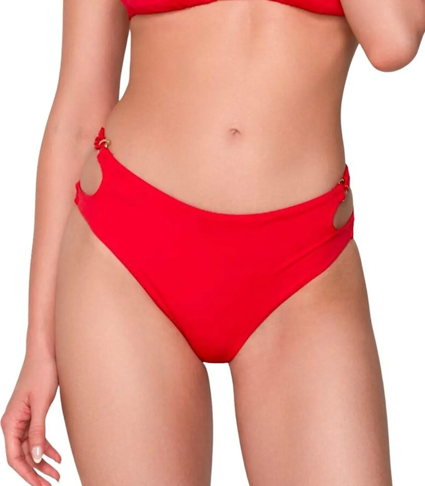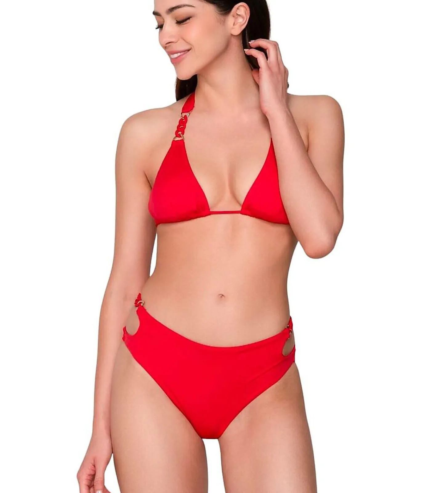Bikinibroekje in een klassieke mid–rise bikinisnit voor comfortabele, elegante bedekking. De originaliteit wordt onthuld door decoratieve openingen op de heupen, met een ketting detail passend bij het zwempak en op zijn plaats gehouden door gouden gespen. Deze sensuele touch voegt een unieke subtiliteit toe aan uw zwemkleding. De techno polyamide stof is gemaakt van een effen stof, is extreem resistent en biedt een perfecte pasvorm. Het heeft een UPF 50+ index voor maximale bescherming van de huid na lange blootstelling aan zonnestralen. Klein goudkleurig logo op de achterkant.[Zwempakje apart verkrijgbaar. Topje en zwembroekje worden apart verkocht. De top, sieraden en andere accessoires die het model op de foto’s draagt, zijn niet inbegrepen].