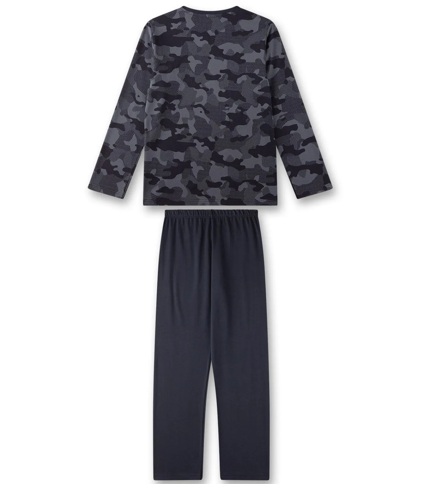 Lange pyjama voor jongens van het merk Sanetta. Shirt met lange mouwen, all–over print en ronde hals. Effen lange pyjamabroek.