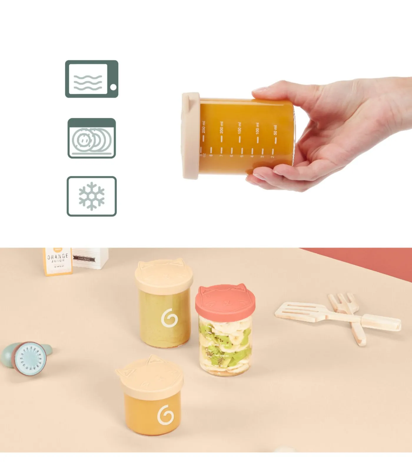 Bestand tegen zeer hoge temperaturen & thermische schokken 100% luchtdicht siliconen deksel Nauwkeurige graduatie Stapelbare potten voor optimale opslag Geschikt voor magnetrons, dubbele boilers en flessenwarmers Kan worden gesteriliseerd