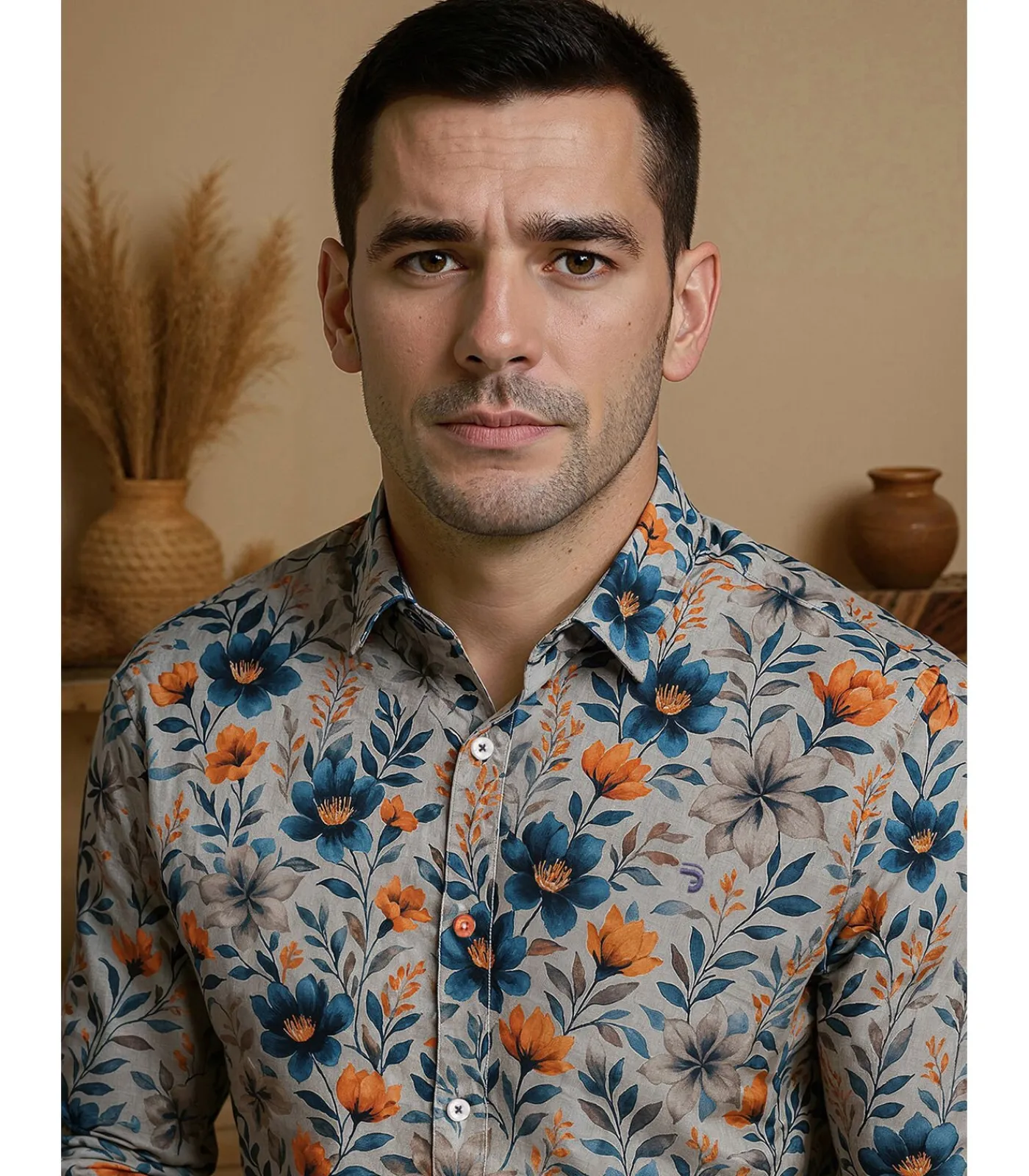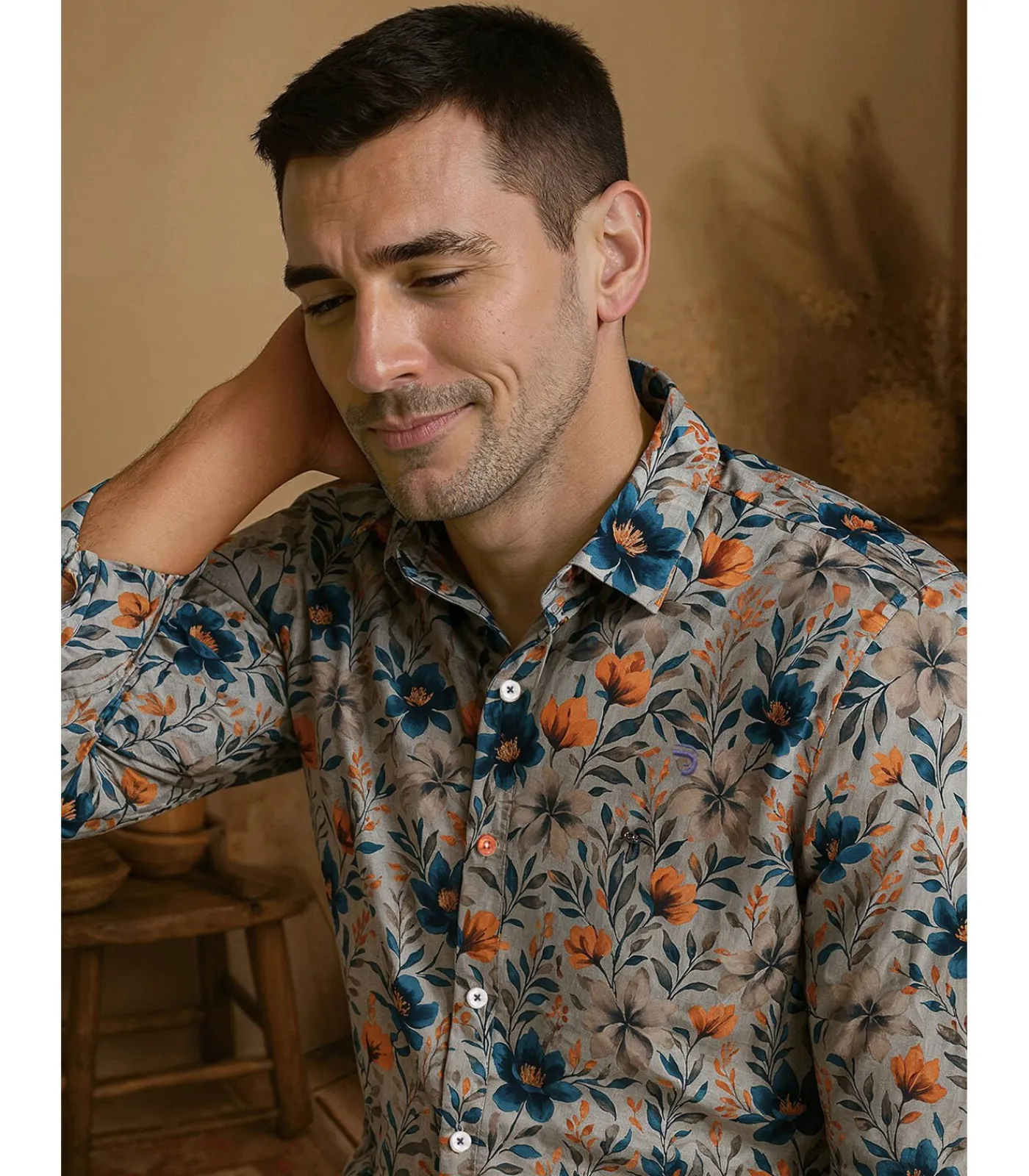Ga voor een stijlvolle en trendy look met dit grijze herenoverhemd met bloemenmotief, geïnspireerd op de betoverende sfeer van Santiago. Gemaakt van 100% katoen, biedt dit overhemd optimaal comfort dankzij de rechte snit en zorgvuldige details. Het plantenprintpatroon zorgt voor een frisse en moderne touch, terwijl de klassieke kraag en knoopsluitingen een vleugje verfijning toevoegen. De lange mouwen en afgeronde manchetten zorgen voor een klassieke en veelzijdige stijl. Het geborduurde J&JOY–logo op de borst en het koord geven dit must–have item een vleugje authenticiteit. Bestel nu en voeg een vleugje charme toe aan je garderobe.