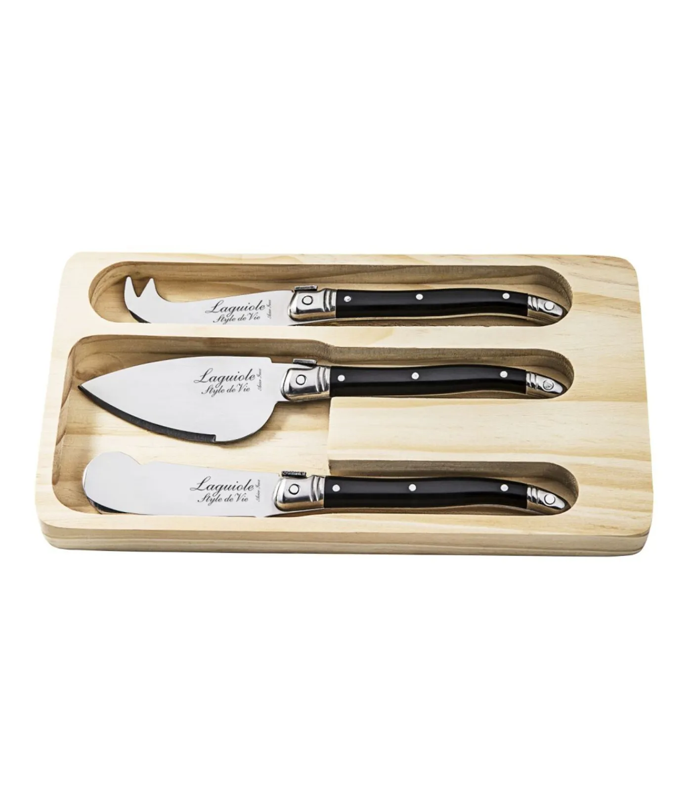 Met deze kaasmessenset van Laguiole Style de Vie presenteert u uw kaasplankje in stijl. De set bestaat uit drie kaasmessen voor verschillende kaassoorten. De kaasmessenset wordt geleverd in een houten tray en alle messen zijn voorzien van een glad lemmet van 1.2 mm. Daarnaast zijn de messen vaatwasserbestendig.