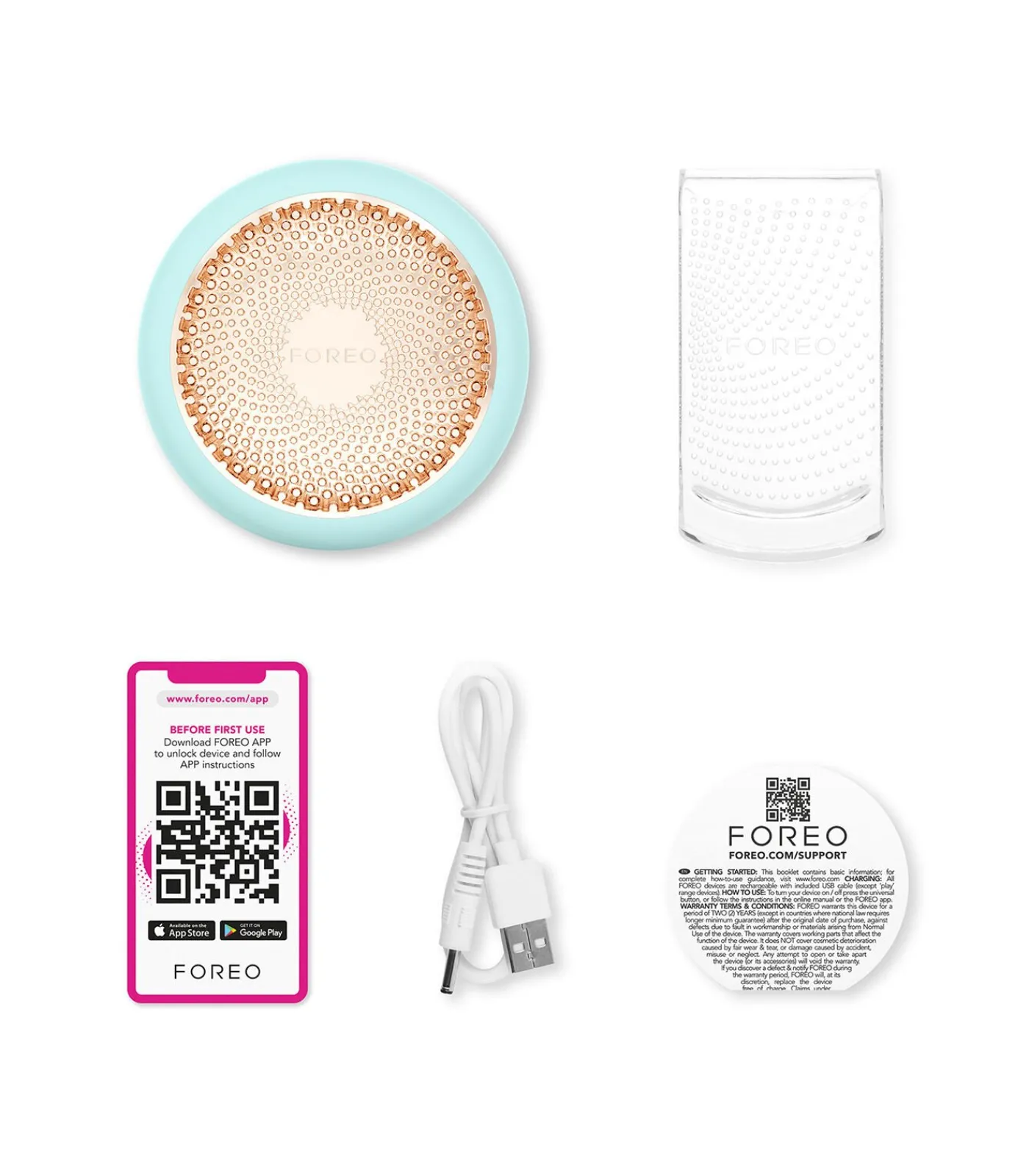 ONMIDDELLIJKE DIEPE HYDRATATIE & GLOW – ALTIJD EN OVERALOndanks het kleine formaat is de UFO™ 3 go in staat om een skincare revolutie te starten! UFO™ 3 go verwent je huid, behandeling na behandeling, waar het avontuur ook naartoe gaat. Laat je niet misleiden door het compacte, reisvriendelijke formaat. Het kleine zusje van de UFO™ 3 deelt dezelfde technologie en personalisatie mogelijkheden, waardoor zelfs de meest veeleisende gebruiker onder de indruk is. Dankzij het reisvriendelijke formaat van de UFO™ 3 go, kun jij de kracht van UFO™ 3 eenvoudig overal mee naartoe nemen.Naarmate we ouder worden, verliest de huid vocht. Dit tast de huidstructuur aan, waardoor deze kwetsbaarder wordt voor barsten, breken, rimpels, vlekken, dofheid, ontstekingen, wallen, kringen onder de ogen en gevoeligheid. Van UFO™ 3 go is bewezen dat het de hydratatie in 2 minuten met 126% verhoogt en de zichtbaarheid van rimpels in 7 dagen vermindert. De thermo–therapie helpt de huid om de ingrediënten en het vocht van het masker dieper te absorberen, verbetert de elasticiteit en maakt de huid voller, zachter en gladder. LED–lichttherapie met een volledig spectrum licht stimuleert de collageenproductie en verfijnt de huid, bestrijdt lijntjes, oneffenheden en dofheid. Geniet van een diepe T–Sonic™ massage om de spanningspunten in de gezichtsspieren te ontspannen en stimuleert de bloedsomloop om voedingsstoffen en zuurstof naar elke huidcel te brengen voor een frisse glow. De Easy Mode is ontworpen voor persoonlijke zelfzorg en biedt toegang tot 8 van je eigen aangepaste behandelingen in offline modus. Bewezen effectiever dan een sheet mask alleen en UFO™ 3 go gaat perfect samen met UFO™ geactiveerde maskers en FOREO’s dual–mode sheet masks. Voldoe aan alle behoeften vna je huid en verken de voorgeprogrammeerde behandelingen voor de allerbeste resultaten, of creëer jouw eigen behandelingen. Locaties zijn irrelevant. Routines zijn belangrijk.