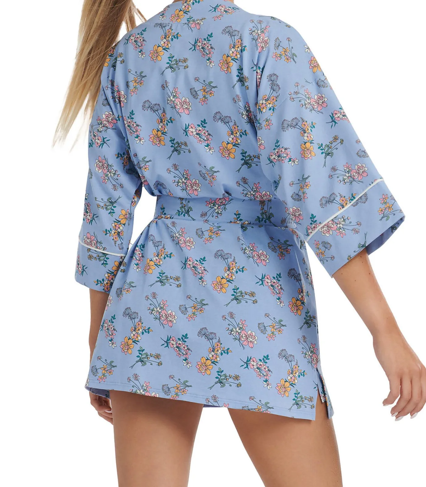 Deze zomerpyjama zal u bekoren met zijn verfrissende kleurenpalet en prachtige bloemenpatroon. Het is licht en comfortabel, en het katoenen breisel sluit goed aan op het lichaam. Twee kleurencombinaties: bloemen op een groene achtergrond, of bloemen op een blauwe achtergrond.[Jurk die alleen wordt verkocht. Pyjama’s, lingerie en andere accessoires die het model op de foto’s draagt, zijn niet inbegrepen].