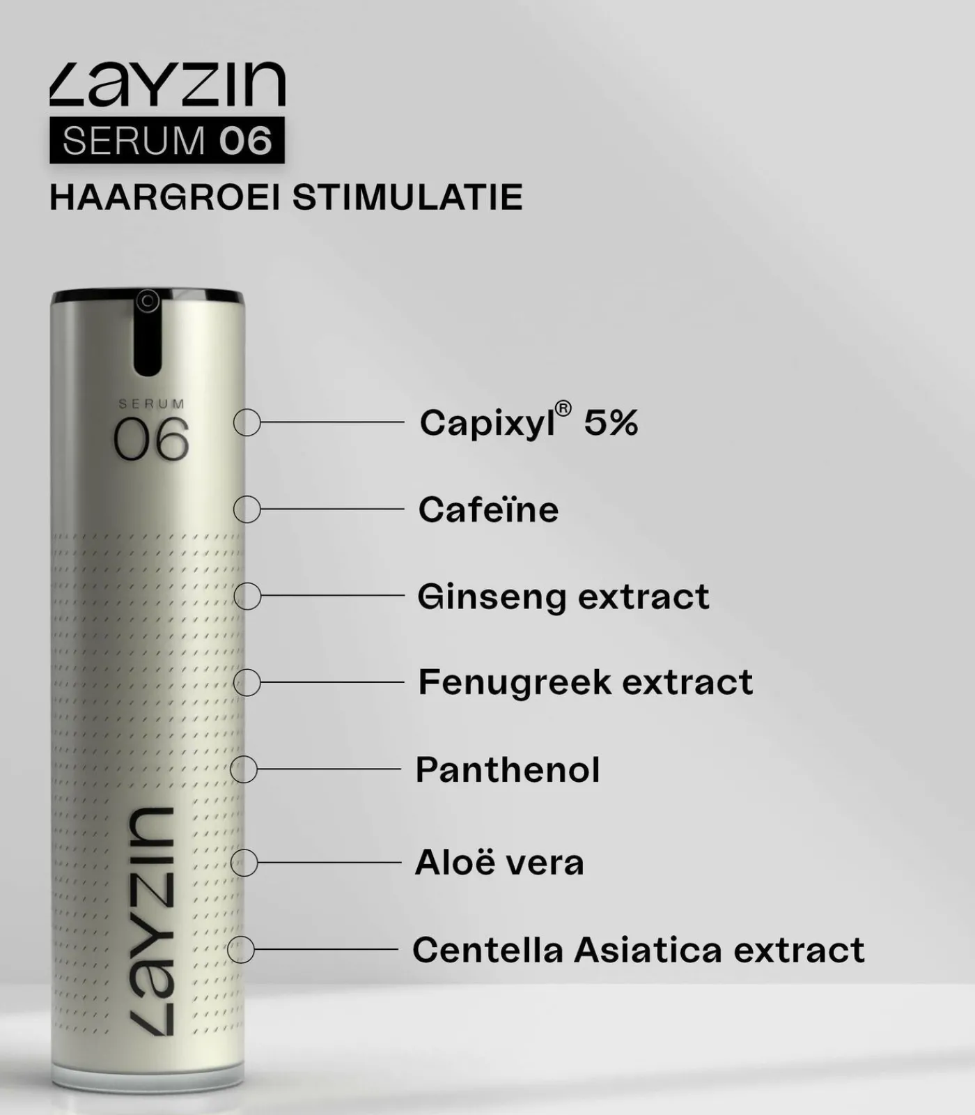 Stop haaruitval en versterk je haren met SERUM 06, het innovatieve haargroeiserum van LAYZIN. Dit serum combineert wetenschappelijke inzichten met krachtige actieve ingrediënten die de gezondheid van je haarfollikels ondersteunen en de meest voorkomende oorzaken van haarverlies aanpakken. Volledig vrij van hormonen en Minoxidil, verzorgt SERUM 06 je hoofdhuid zonder irritatie.Hoe SERUM 06 werkt