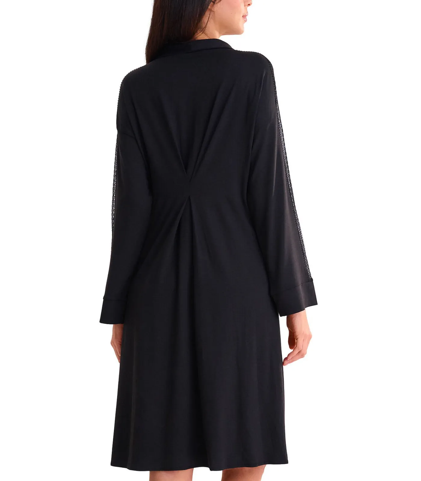 Negligé met lange mouwen, sjaalkraag en sluiting net boven de taille. Ingenaaide plooien aan de voorkant, zijkanten en middenachter creëren een elegante lijn. Fijn kant langs de mouw zorgt voor een subtiele decoratieve touch. Lengte ca. 100 cm.