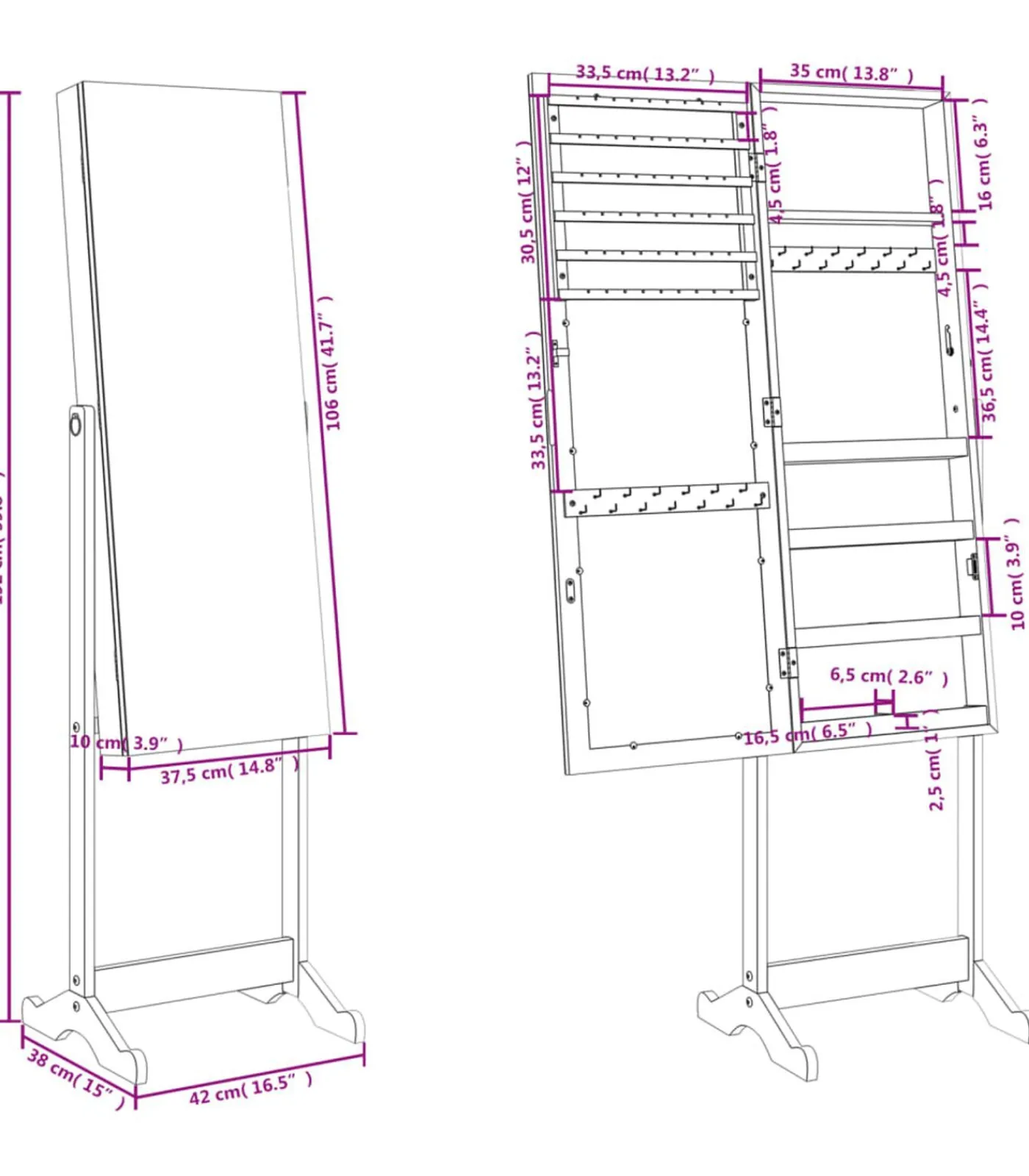 Vrijstaand ontwerp: deze vrijstaande sieradenopberger kan eenvoudig overal in je slaapkamer, woonkamer of waar je maar wilt worden geplaatst. En de basis met 2 poten houdt deze sieradenspiegel in balans en stabiel, zelfs wanneer hij van binnen volgeladen is.