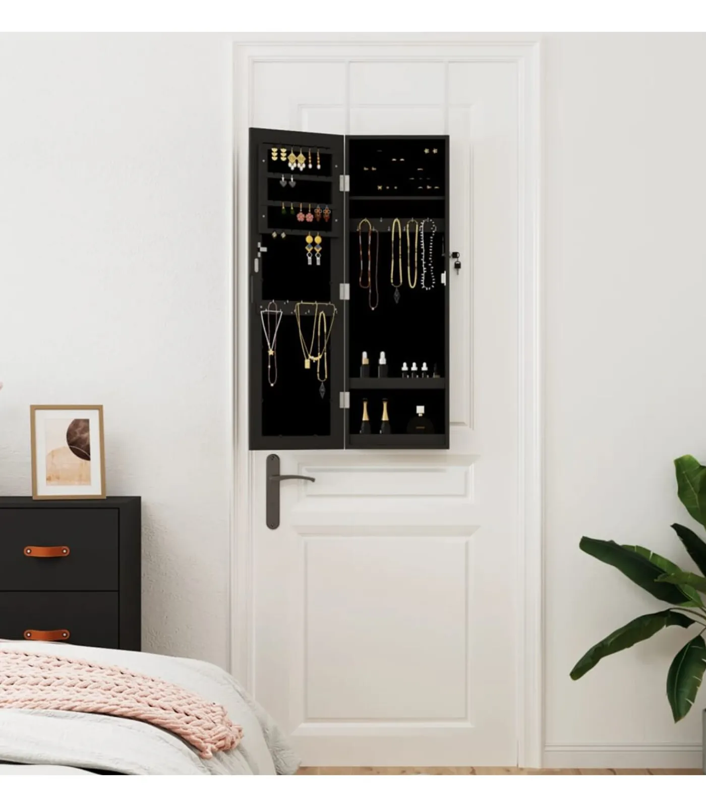Voldoende opbergruimte: de spiegel met opbergruimte heeft veel haakjes, hangers en plankjes om je sieraden netjes geordend en binnen handbereik te houden.