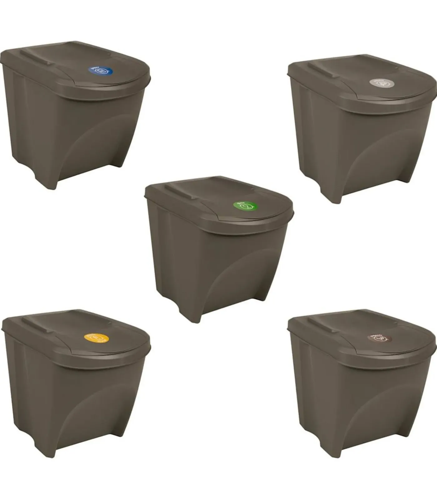 Met afvalscheidingslabels voor elke bak (glas, papier, plastic, gft, overig)