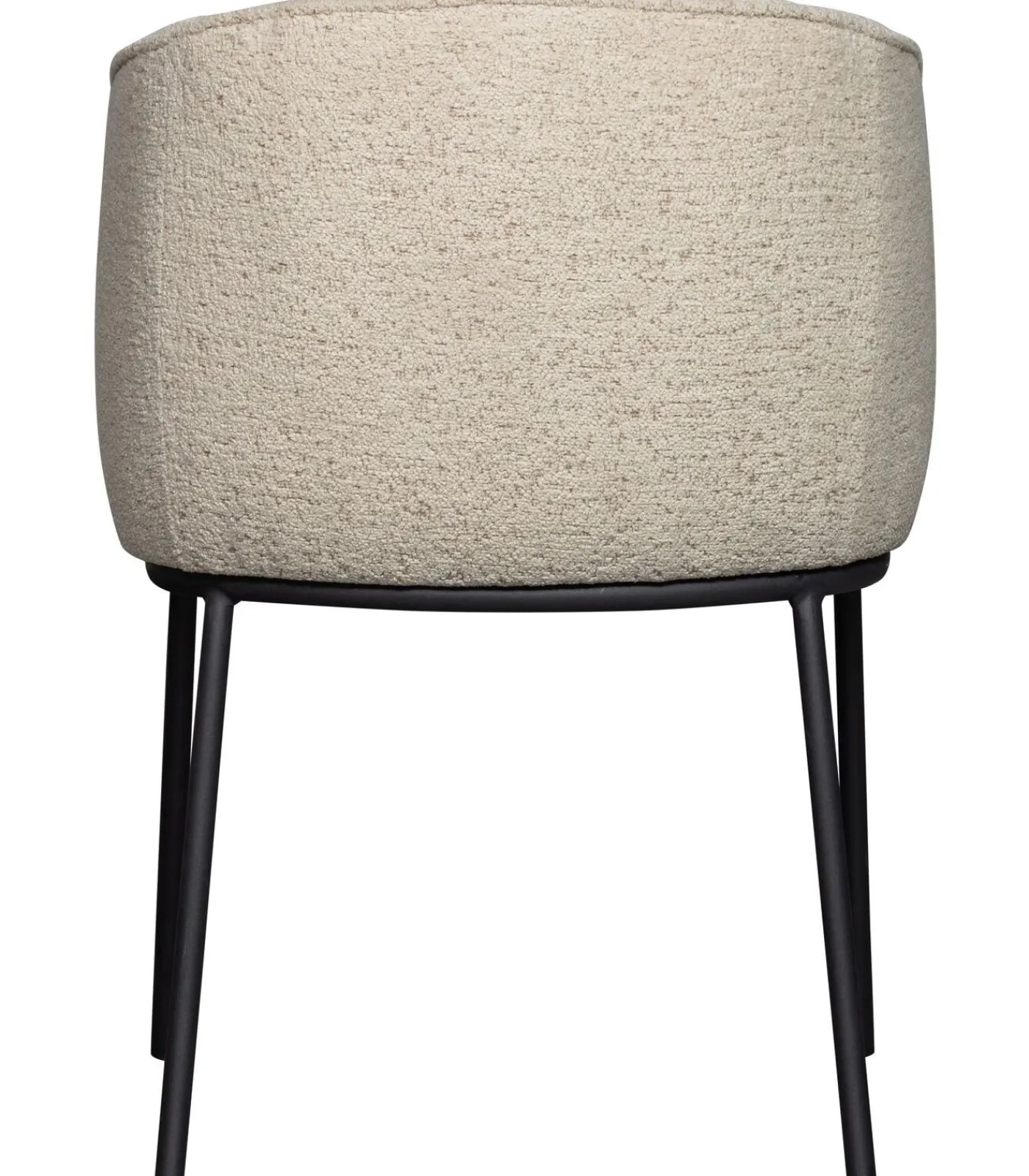 Onze Happy bouclé heeft een rijke textuur die direct warmte in huis brengt. De Martindale–waarde van deze bouclé is niet beschikbaar, maar de dichte weeftechniek zorgt voor sterkte en vormvastheid, waardoor de stof niet snel zal slijten of scheuren. De kleuren zijn hoog kleurvast; vermijd direct zonlicht om verkleuring te voorkomen. Het onderstel is vervaardigd uit metaal voor een stabiele basis.