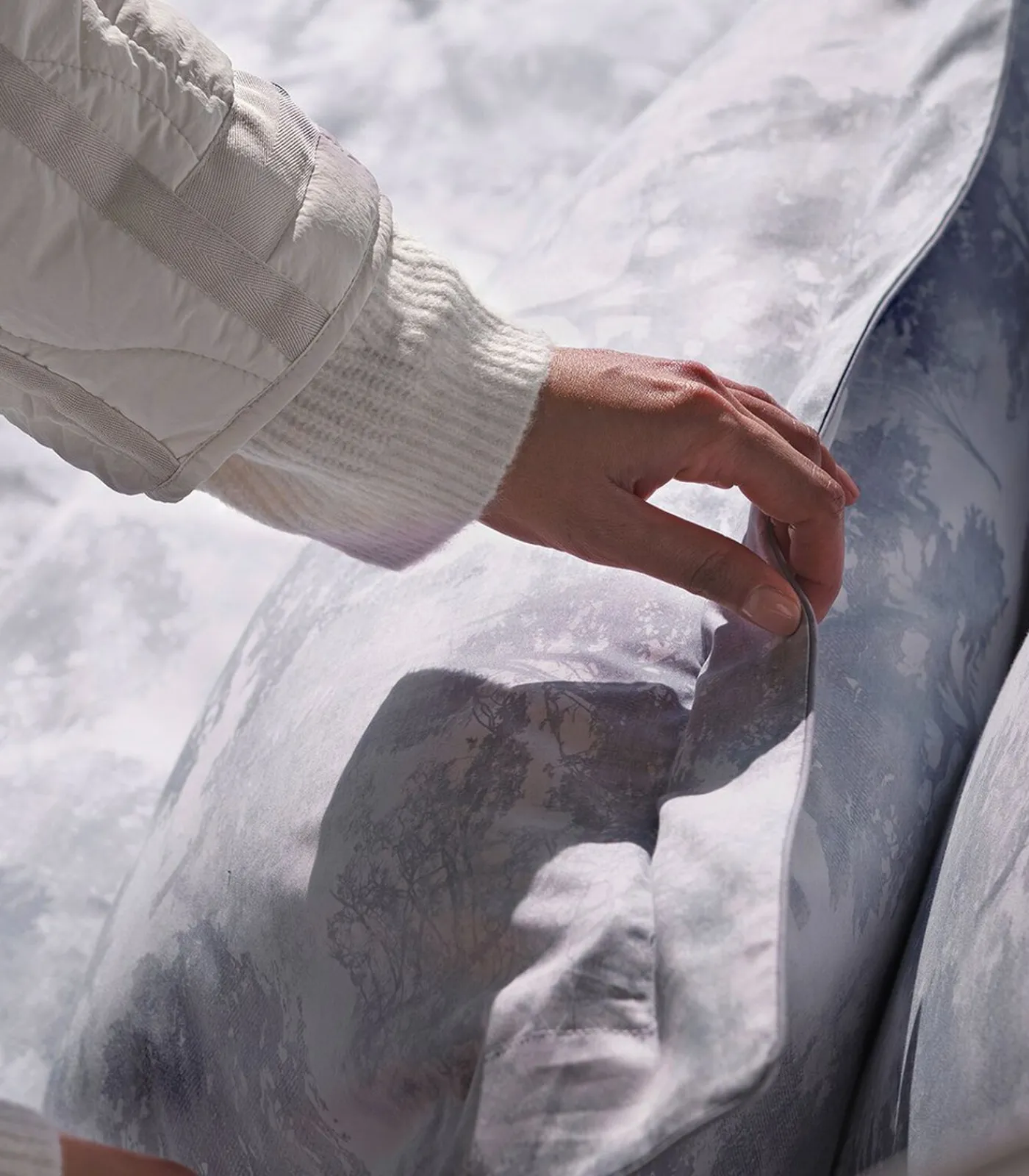 Voor– en achterkant bedrukt met aquarelgrijze en blauwachtige esdoornbladeren