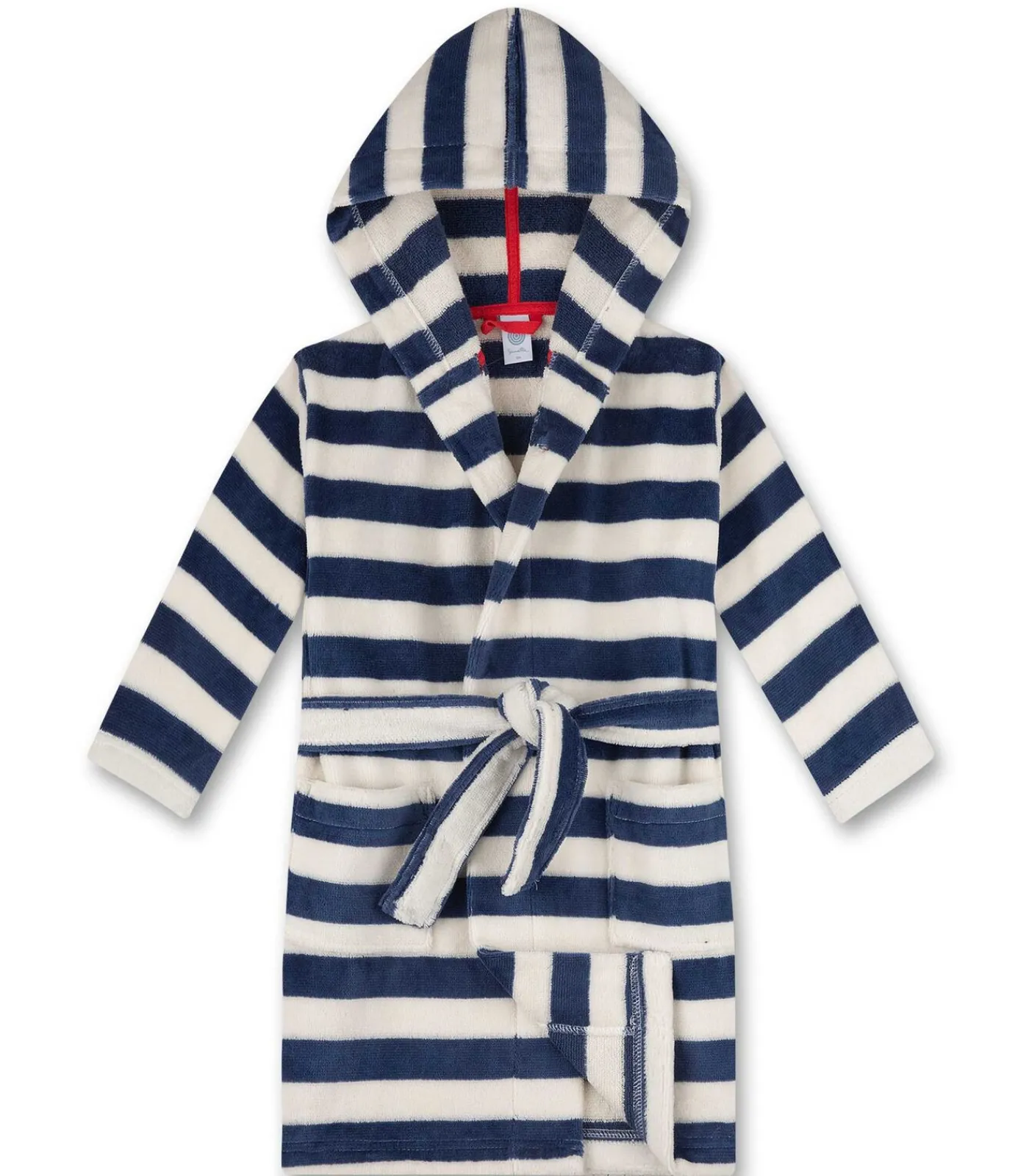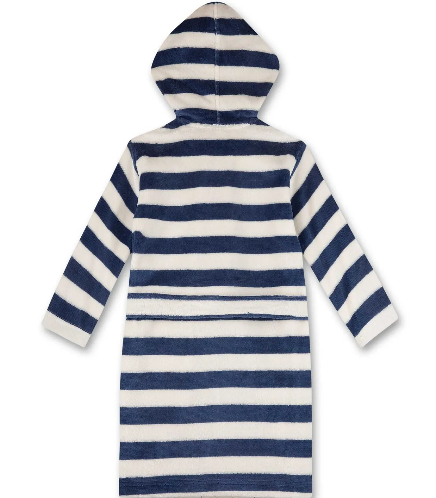 Badjas voor jongens van het merk Sanetta. Gestreepte jas met een capuchon, bindceintuur en twee zakken aan de voorkant. Zachte katoenmix.