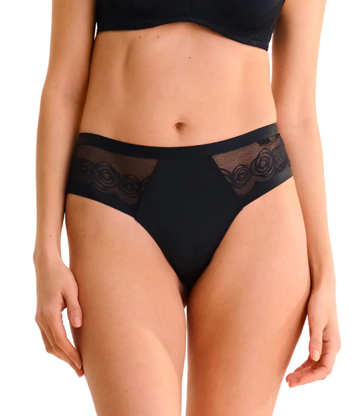 Braziliaans met een snit die op een verleidelijke manier je pluspunten accentueert. Comfortabel, zacht katoenen breisel gecombineerd met transparante kanten panelen aan de zijkanten en achterkant, fijn geborduurd met bloemmotieven die een vleugje vrouwelijkheid en verfijning toevoegen. In de tailleband is decoratief plat elastiek genaaid voor extra comfort. Een dunne, zachte, platte rand is genaaid in de beenopeningen voor een naadloze look onder kleding. Verleidelijke lingerie voor dagelijks comfort. Katoenen kruisje voor gegarandeerd intiem comfort.