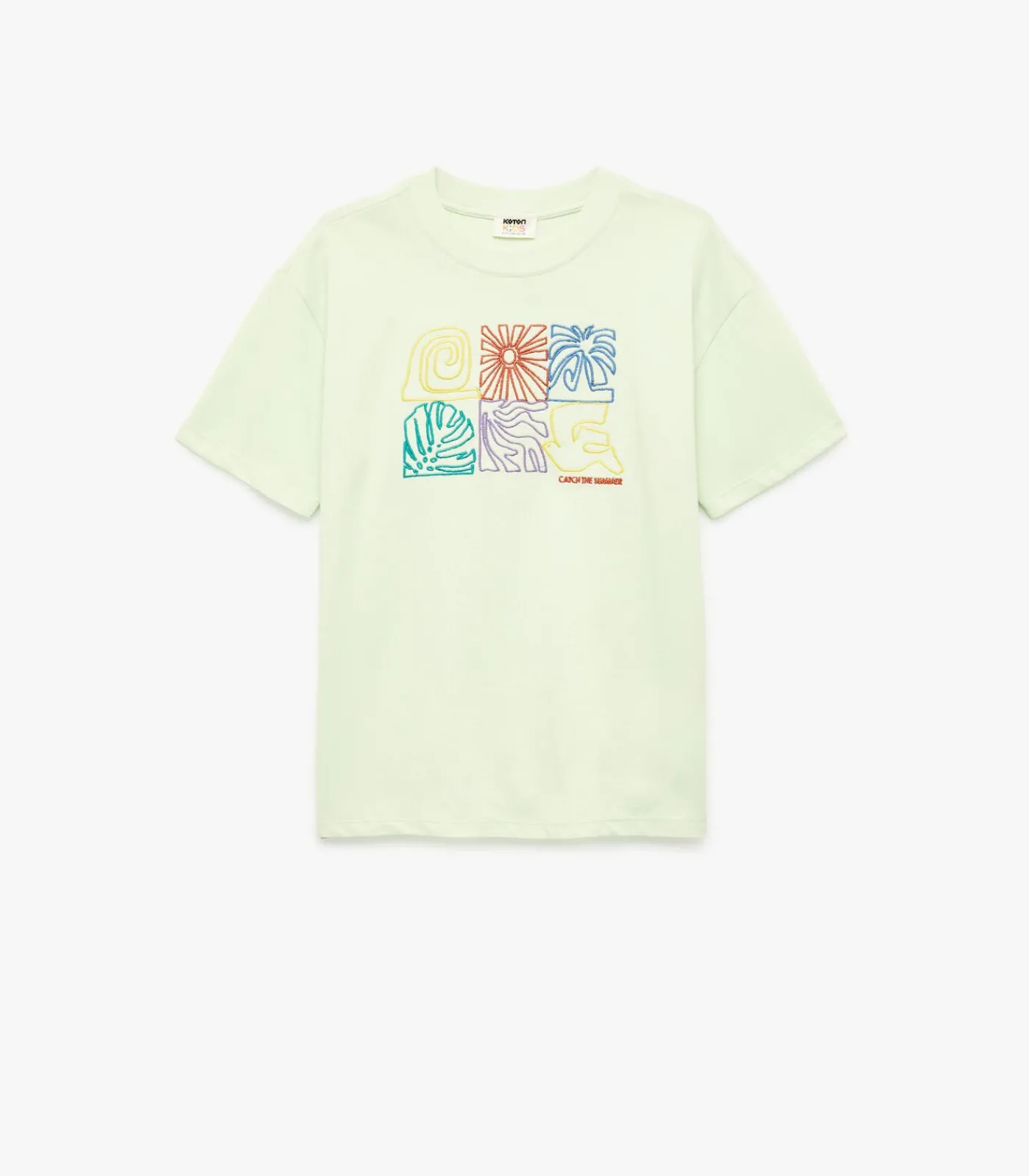 Short–sleeved crew neck t–shirt with cotton embroidery detail.