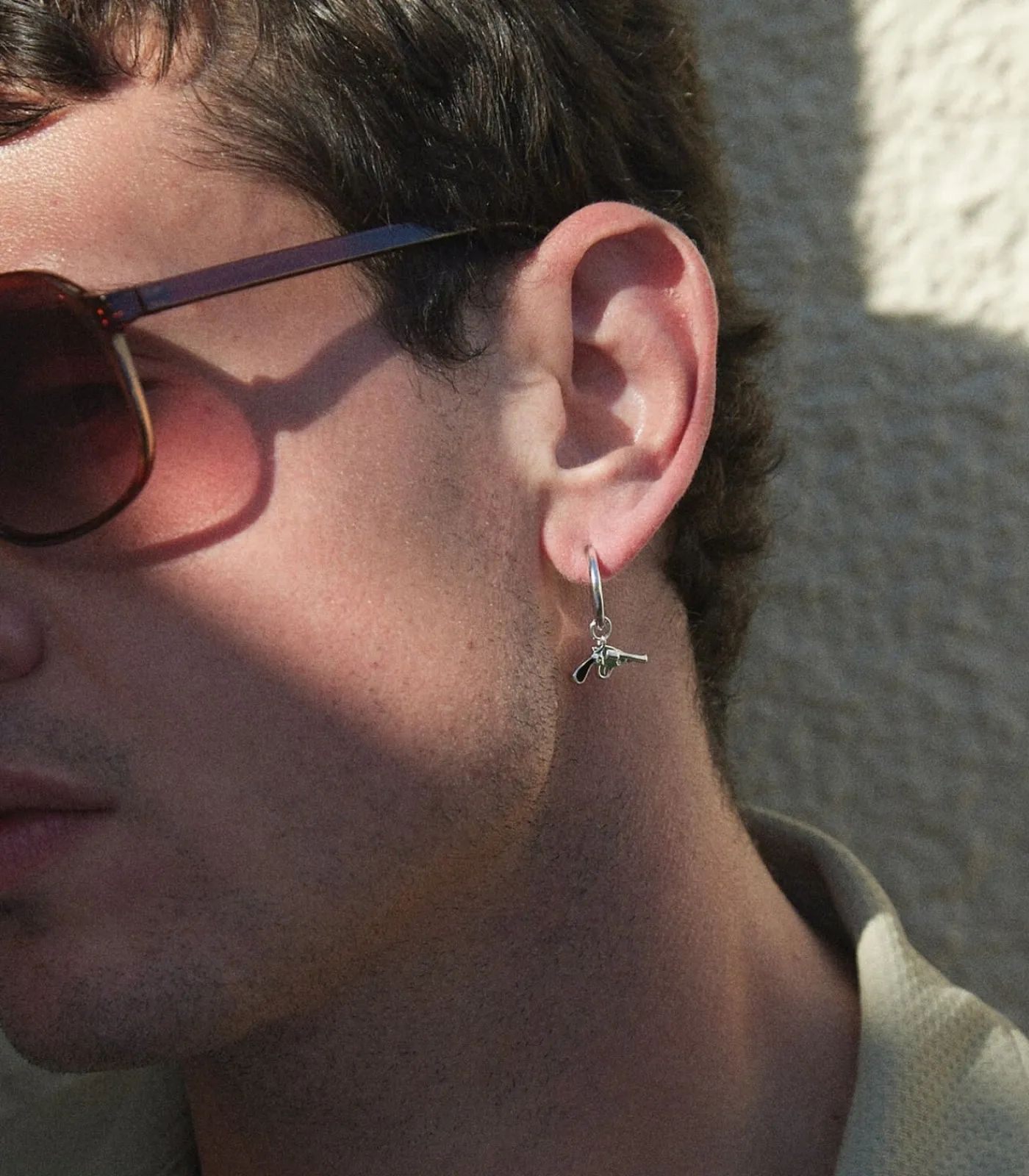 DETAILSGun N Roses piercing oorbel vervaardigd uit 925 Sterling Zilver, nikkelvrij metaal en rhodium plating. De ring is gemaakt van zilver en het pistoolvormige ornament is gemaakt van nikkelvrij metaal en beschilderd met zwarte email.Materiaal: 925 Sterling Zilver en nikkelvrij metaal.Afwerking: Rhodium plating.Sluiting: Klik.Afmetingen: Buitendiameter: 16 mm, Binnendiameter: 14 mm, Bedel: 18 mm x 8 mm.Wordt per stuk verkocht.INSPIRATIEWij ontwerpen en vervaardigen sieraden van hoogwaardige materialen en halfedelstenen.Neem deel aan het recyclingproces van Earcandy. Geef het product een tweede leven als je het zat bent! Voor meer informatie, lees ons recyclingproces.