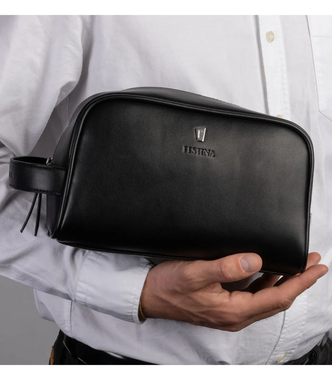 De reislijn “Classicals” van Festina is nu al iconisch. Elk detail van dit product is zorgvuldig ontworpen en vervaardigd, met als doel een praktisch, luxueus en gemakkelijk te dragen accessoire aan te bieden dat de perfecte metgezel zal zijn tijdens uw reizen of werkdagen. De lijn is gemaakt van prachtig getextureerd vegan leer. Elk product is voorzien van het iconische “F” signatuurplaatje, onderstreept door een festina–logo in reliëf. Nieuwe, iconische ritstrekkers, geïnspireerd op de stopknop van het Festina huishorloge, gegraveerd met het Festina blazoen en versierd met vegan leder, zorgen voor een vleugje ingetogen luxe. De binnenzijde is zorgvuldig afgewerkt, met een voering met monogram. Dit cosmeticatasje is gemakkelijk mee te nemen dankzij de handgreep met riempje, waarop ook het merklogo is aangebracht. Deze zwarte versie, met zijn knapperige verchroomde metalen randen, is een echte klassieker waarmee je niet de fout in kunt gaan. Dimensions: 230 x 110 x 150 mm, Material: Polyester