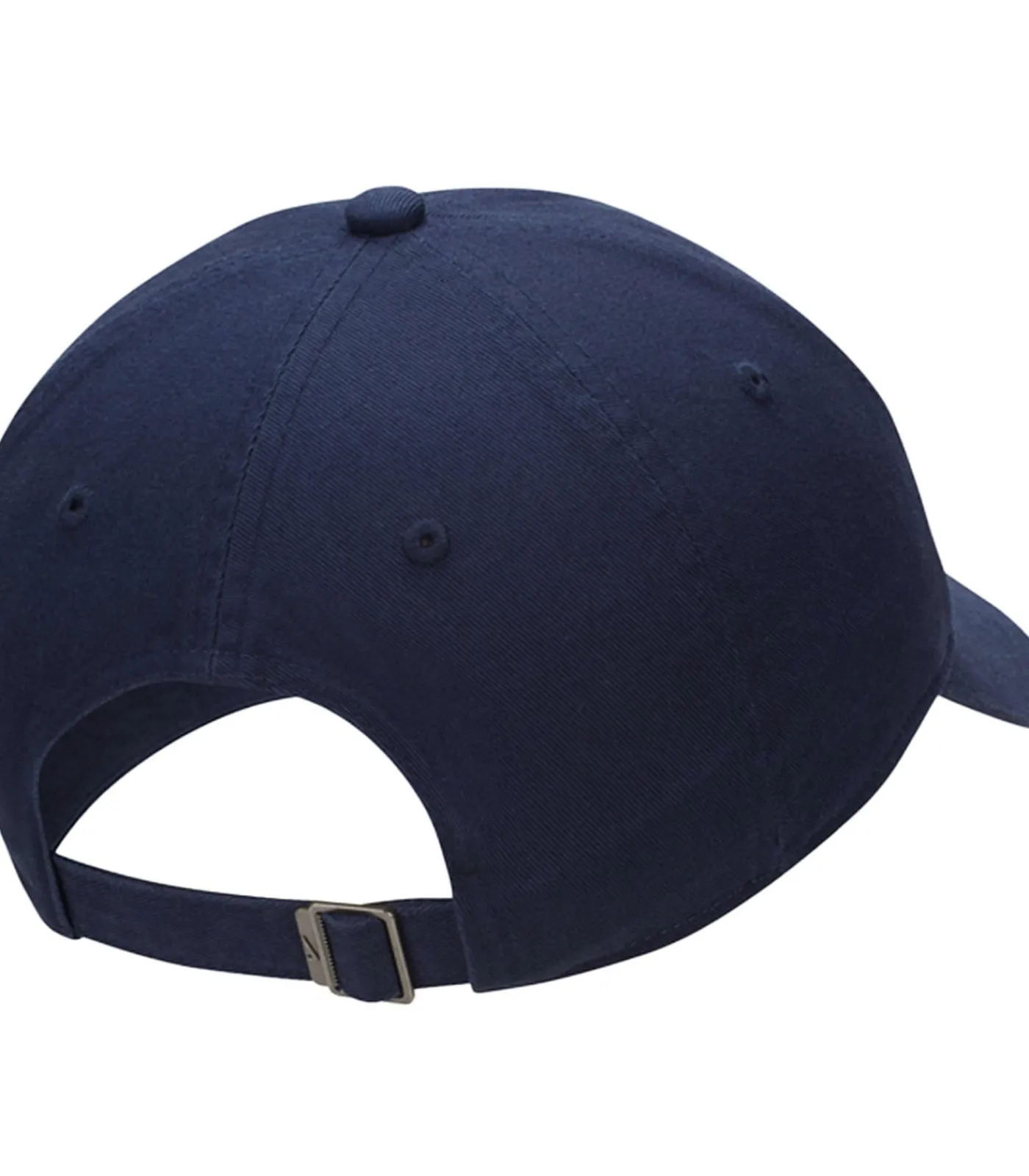 Nike CLUB Baseball Pet Marineblauw – Dit product is gemaakt door de beroemde sportmerk Nike en bestaat uit 100% katoen. Het is opgebouwd met gebreid stof en heeft een geborduurd ontwerp met een logolijst en een eenvoudig design. Bovenaan bevindt zich een knoop, de rand is gebogen, de ogen zijn voorzien van geborduurde oogjes en er bevindt zich een panel met een gestuwde piek. De sluiting van het product is verstelbaar en voorzien van een Tri–Glide gesp.