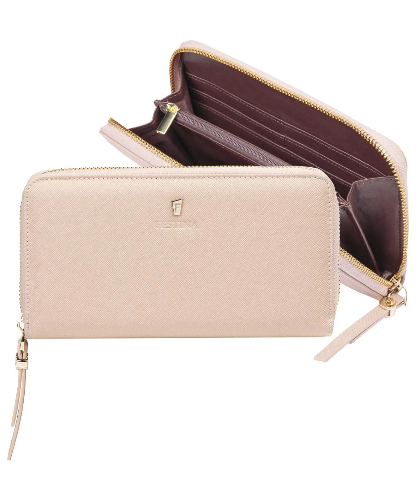 De “Mademoiselle” reisportefeuille is gemaakt van kwalitatief hoogwaardig vegan saffiano leer (PU) met structuur. Elk detail is zorgvuldig afgewerkt, zoals de ritssluiting die is versierd met het Festina blazoen en geïnspireerd op de iconische horlogestopknop van het merk. De damesportemonnee heeft een zeer praktische binnenzijde in contrasterende kleur. Zo heeft deze lichtroze versie heeft een contrasterende bordeauxrode binnenkant. De buitenzijde toont subtiel het Festina logo, in de vorm van een gouden metalen “F” plaatje. Deze luxueuze accessoire wordt geleverd in een bijpassende design geschenkbox. Dimensions: 195 x 25 x 105 mm, Material: Polyurethane