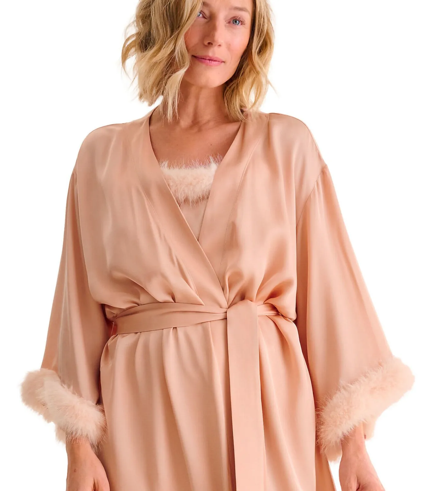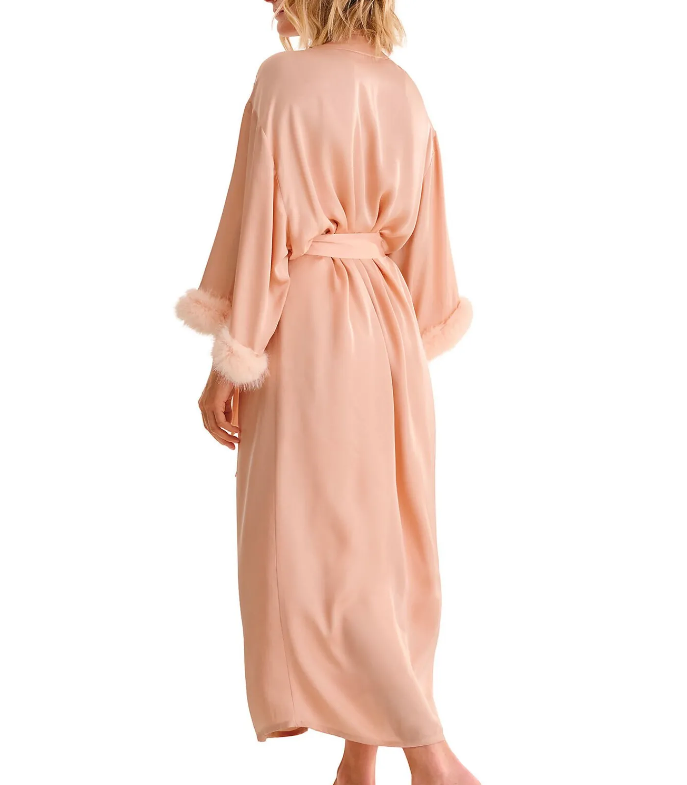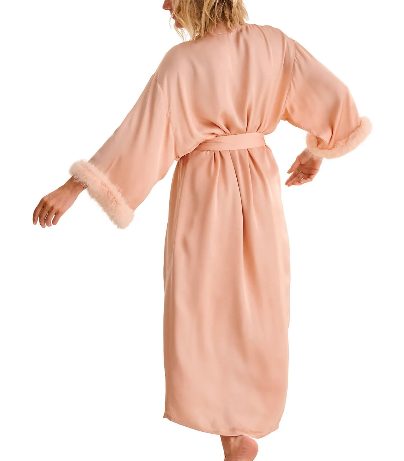 Elegante lange negligé met een losse pasvorm en wijde mouwen versierd met een bontrand. De halslijn is afgewerkt met een zoom over de hele lengte aan de voorkant. Het kan open gedragen worden, of gesloten met een ceintuur om in de taille vast te knopen. Lengte ca. 130 cm.