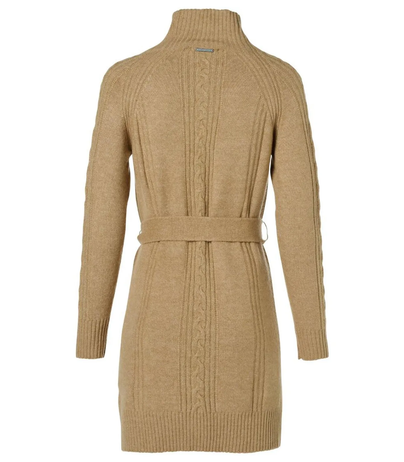 Deze zandkleurige kabelgebreide tuniek met col van Mart Visser combineert elegantie, comfort en een luxe uitstraling. Ontworpen voor de moderne vrouw die houdt van knitwear met karakter, biedt de tuniek een tijdloze zandkleur die harmonieus contrasteert met subtiel gouden lurexgaren, voor een verfijnde glans en een subtiel feestelijk effect. Het kabelpatroon op het voorpand en de mouwen geeft diepte en structuur, terwijl de col en brede ribboorden zorgen voor een eigentijdse, stijlvolle finish. De tuniek is vervaardigd uit een hoogwaardige materiaalmix van 30% polyester, 27% nylon, 25% acryl, 15% wol en 3% spandex, waardoor hij zacht, licht elastisch en vormvast is. Raglanmouwen bieden extra bewegingsvrijheid en een casual, sportieve touch. Met het bijgeleverde los strikceintuur kun je de taille accentueren en zo een vrouwelijke, elegante look creëren. Een subtiel metalen Mart Visser–logo op de achterkant voegt een luxe detail toe. De tuniek valt iets over de heup en is ideaal te combineren met een strakke jeans, legging of panty. Voor een chique city look draag je hem met hoge laarzen en een trenchcoat; voor een ontspannen daglook combineer je met enkellaarsjes en een crossbody tas. De warme zandkleur laat zich gemakkelijk combineren met neutrale tinten zoals crème, bruin of olijfgroen, maar ook met warme metallics zoals goud en koper.