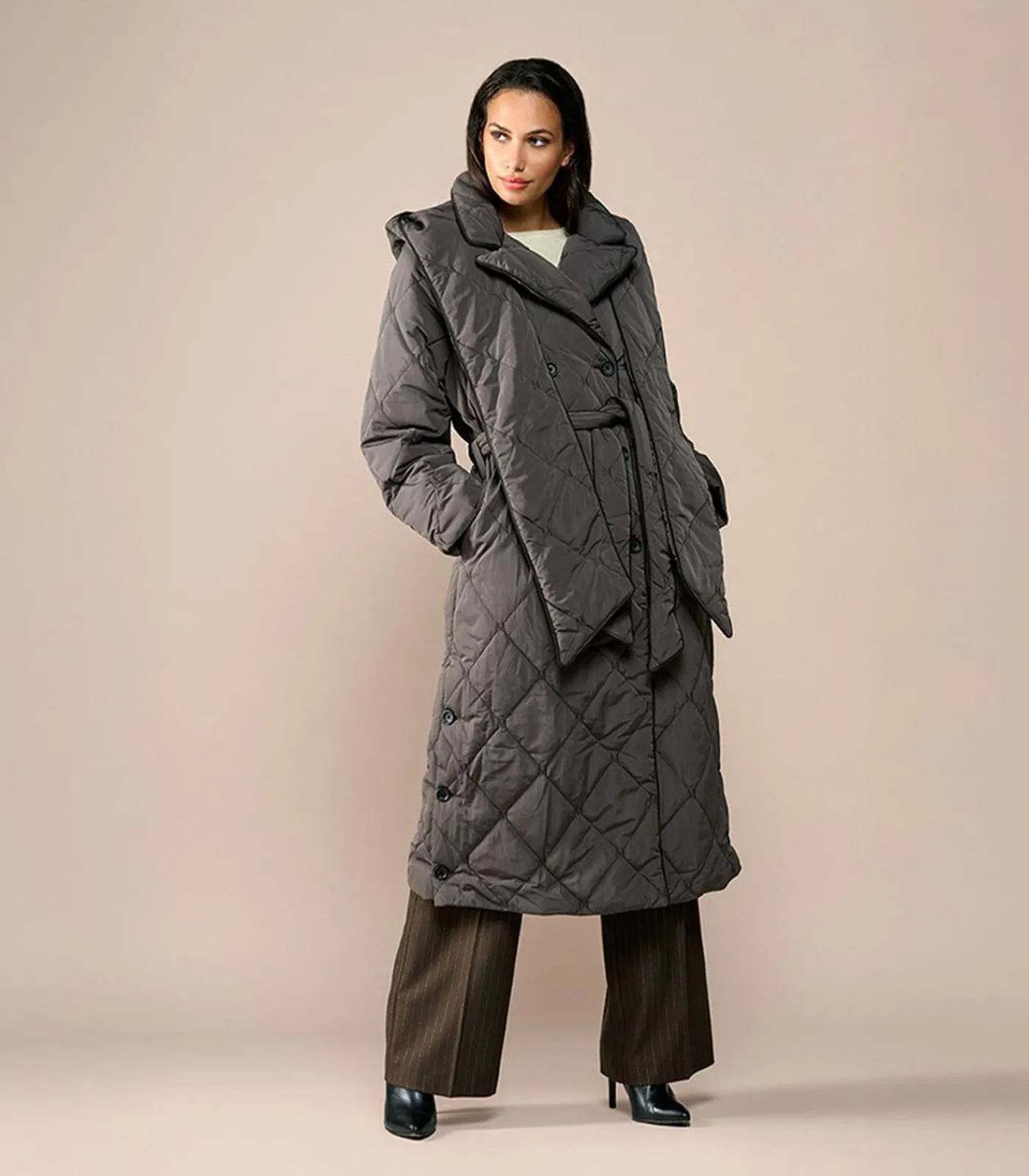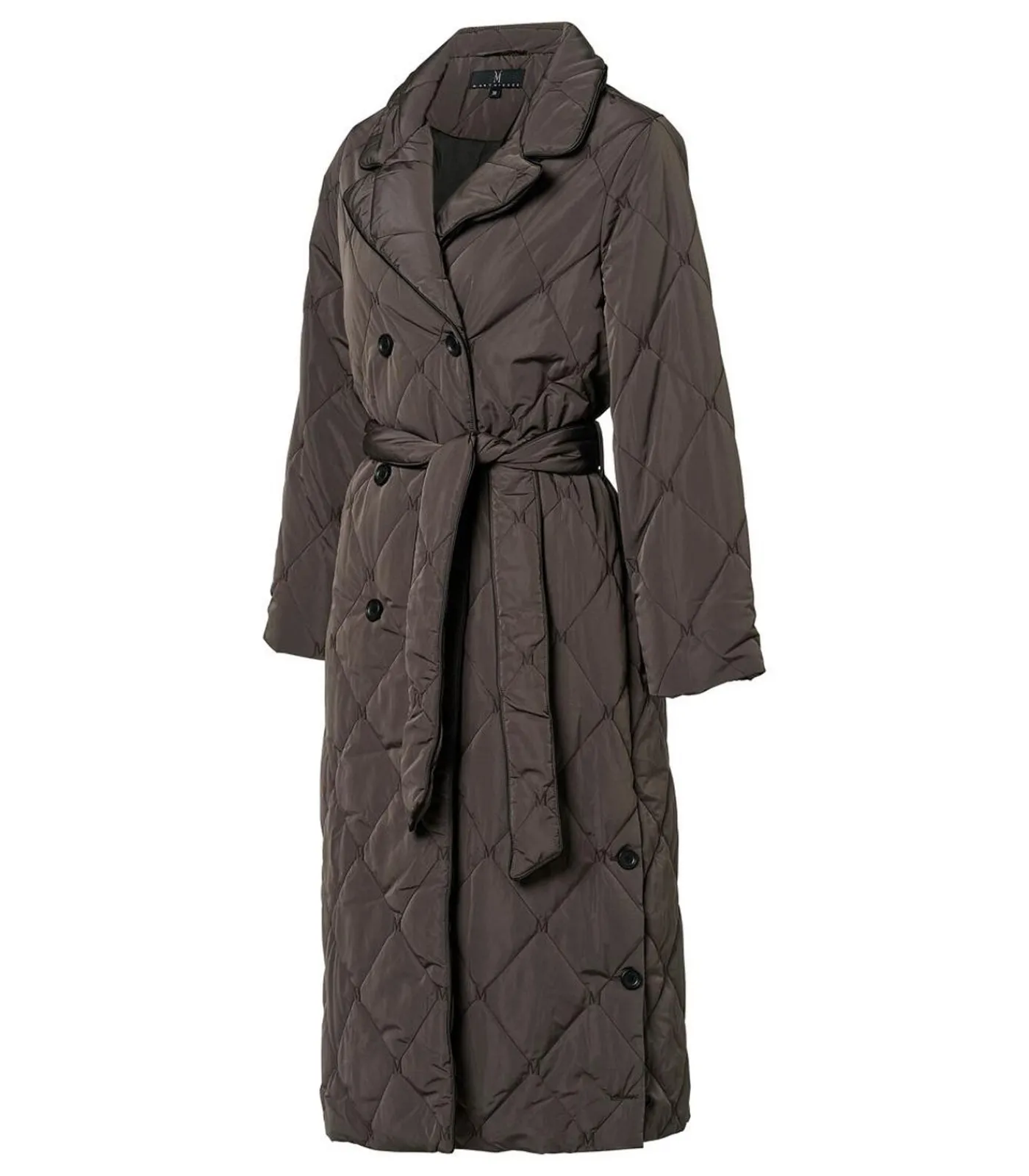 Deze donkerbruine gewatteerde trenchcoat van Mart Visser combineert elegantie, comfort en functionaliteit in één. Het ontwerp volgt de klassieke trenchcoat–stijl, verrijkt met eigentijdse accenten zoals een all–over M–logo dessin en een afneembare capuchon. De lichte maar warme vulling maakt de jas geschikt voor zowel het tussenseizoen als koude winterdagen, terwijl hij soepel langs het lichaam valt tot halverwege de kuit. Met de afneembare strikceintuur kun je eenvoudig een vrouwelijke taille creëren, of kies voor een lossere pasvorm voor een meer casual uitstraling. Knopen aan de onderzijde van de zijnaden kunnen opengezet worden voor extra bewegingsvrijheid, ideaal bij fietsen of wandelen. De boorden van de reversekraag en ceintuur zijn afgewerkt met een donkerbruine bies, en de capuchon is afneembaar dankzij een discrete rits. De diepe donkerbruine kleur straalt warmte en tijdloze elegantie uit en combineert moeiteloos met zowel zakelijke als casual outfits, zoals een pantalon met blouse of een jeans met een grofgebreide trui.