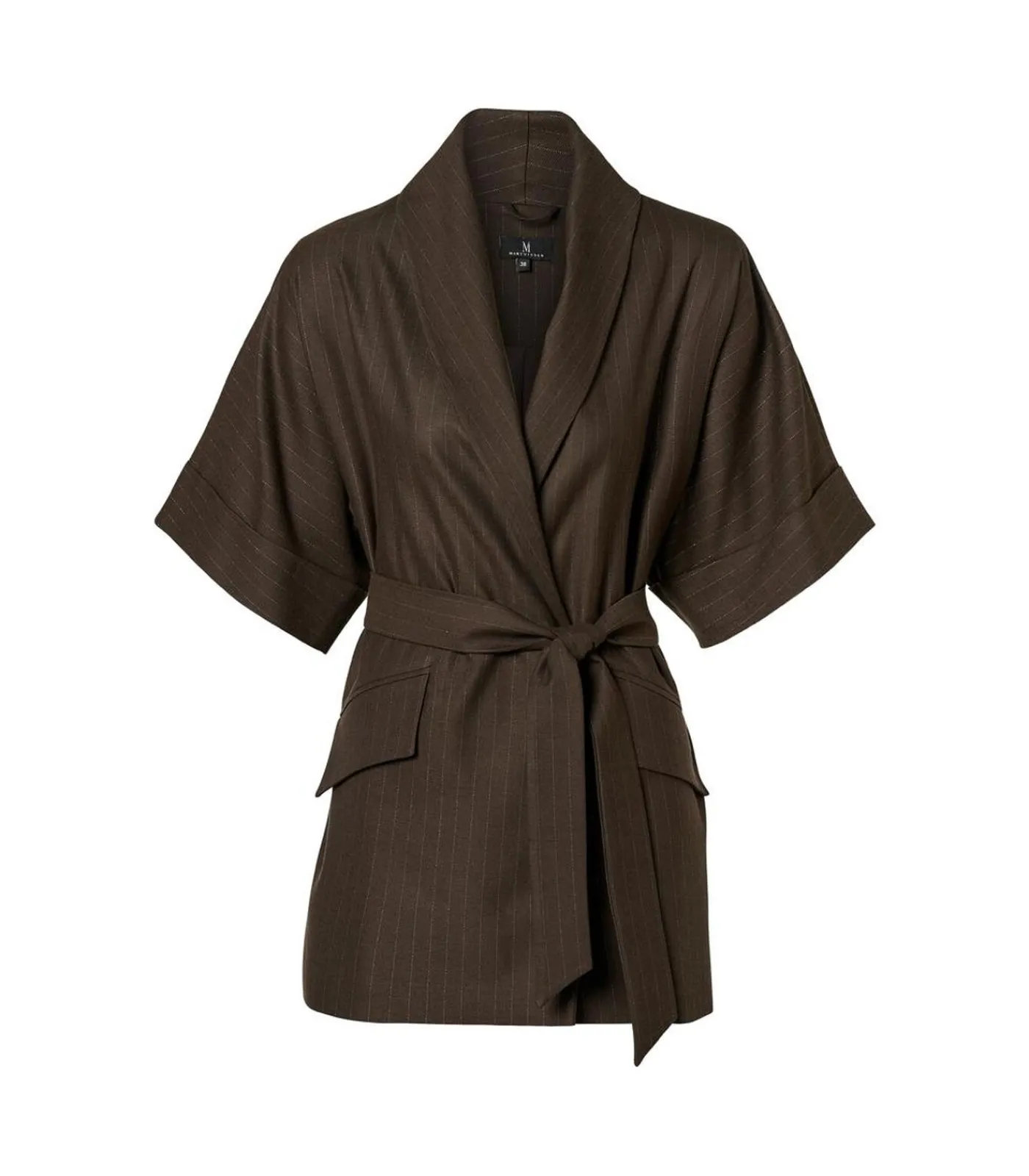 De Roseline blazer is een elegante en veelzijdige damesblazer die moeiteloos stijl toevoegt aan elke outfit. Deze donkerbruine blazer met subtiele offwhite krijtstreep straalt tijdloze klasse en ingetogen luxe uit. Dankzij de overslagsluiting met bijpassende strikceintuur wordt de taille op vrouwelijke wijze geaccentueerd, terwijl de lichte schoudervullingen zorgen voor een mooi gestructureerd silhouet. Deze getailleerde blazer is perfect voor zowel zakelijke gelegenheden als informele momenten. Combineer met een pantalon voor een complete power suit of draag casual met jeans voor een verfijnde look.De Roseline blazer is vervaardigd van een hoogwaardige materiaalmix van 63% polyester, 34% viscose en 3% elastaan. Polyester zorgt voor duurzaamheid en vormvastheid, viscose geeft de blazer een zachte, soepele feel en de toevoeging van elastaan biedt extra comfort en bewegingsvrijheid. De gladde voering van 100% polyester zorgt ervoor dat de blazer mooi valt en prettig aanvoelt op de huid. De combinatie van het klassieke krijtstreep dessin, de flatterende pasvorm en het comfortabele materiaal maakt de Roseline blazer tot een stijlvolle keuze voor elke gelegenheid.