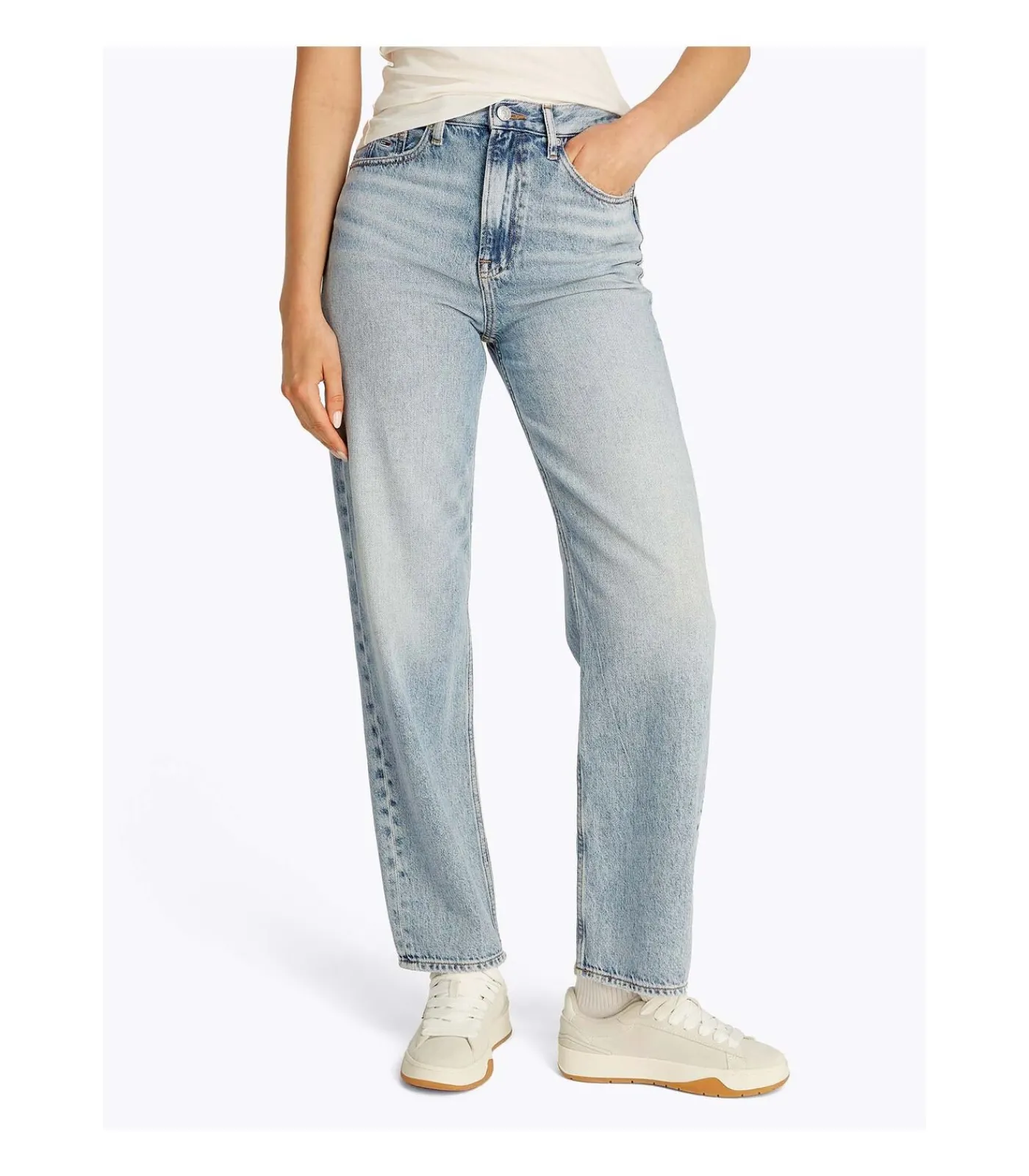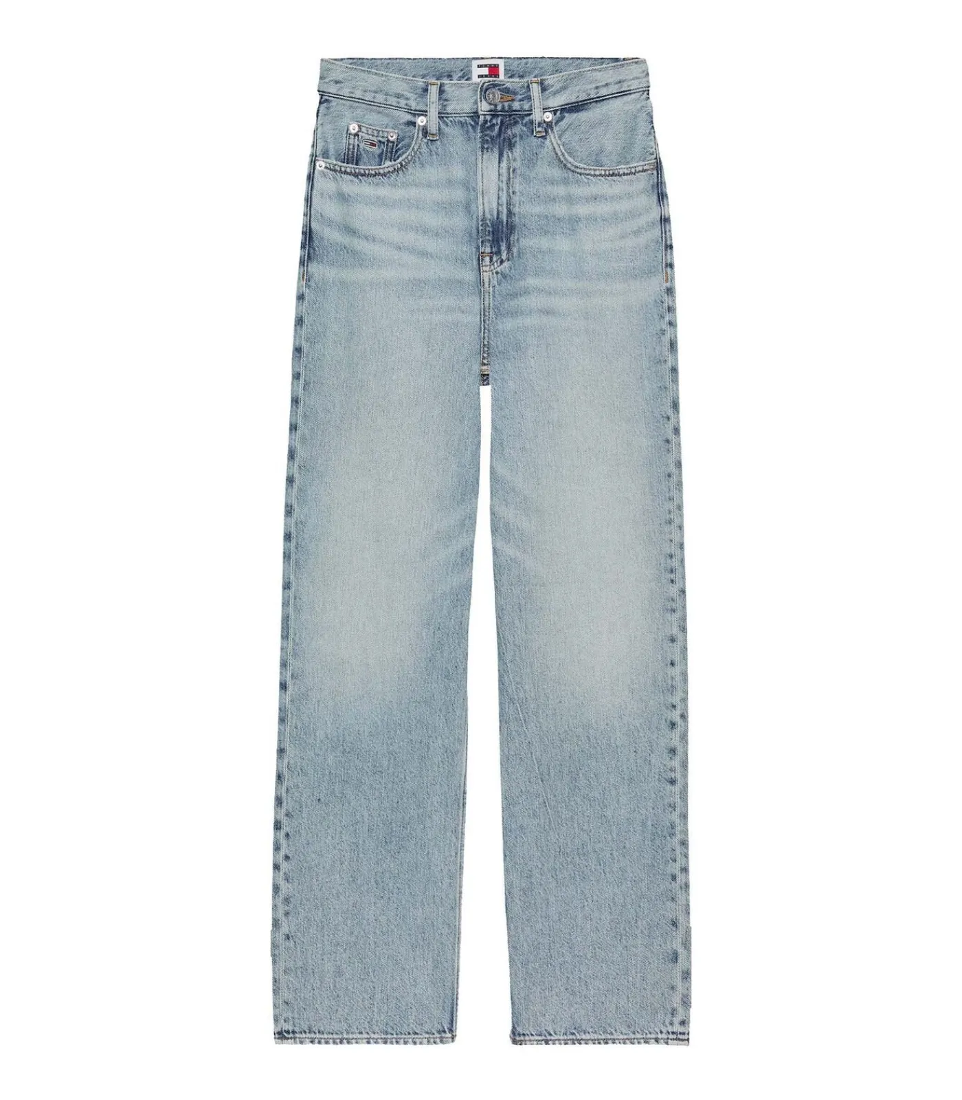 Kleur: Licht denim Samenstelling: 82% katoen, 18% lyocell Lengte: Lang Pasvorm: Slim fit Details: Five–pocket jeans met hoge taille en rechte pijpen, fades en whiskers aan de voorkant, afgewerkt met Tommy Jeans–vlagpatch op de muntzakken en achterkant Gebruik: Ideaal voor casual outfits met een retrogevoel, gemakkelijk te combineren met t–shirts of overhemden voor een altijd actuele look