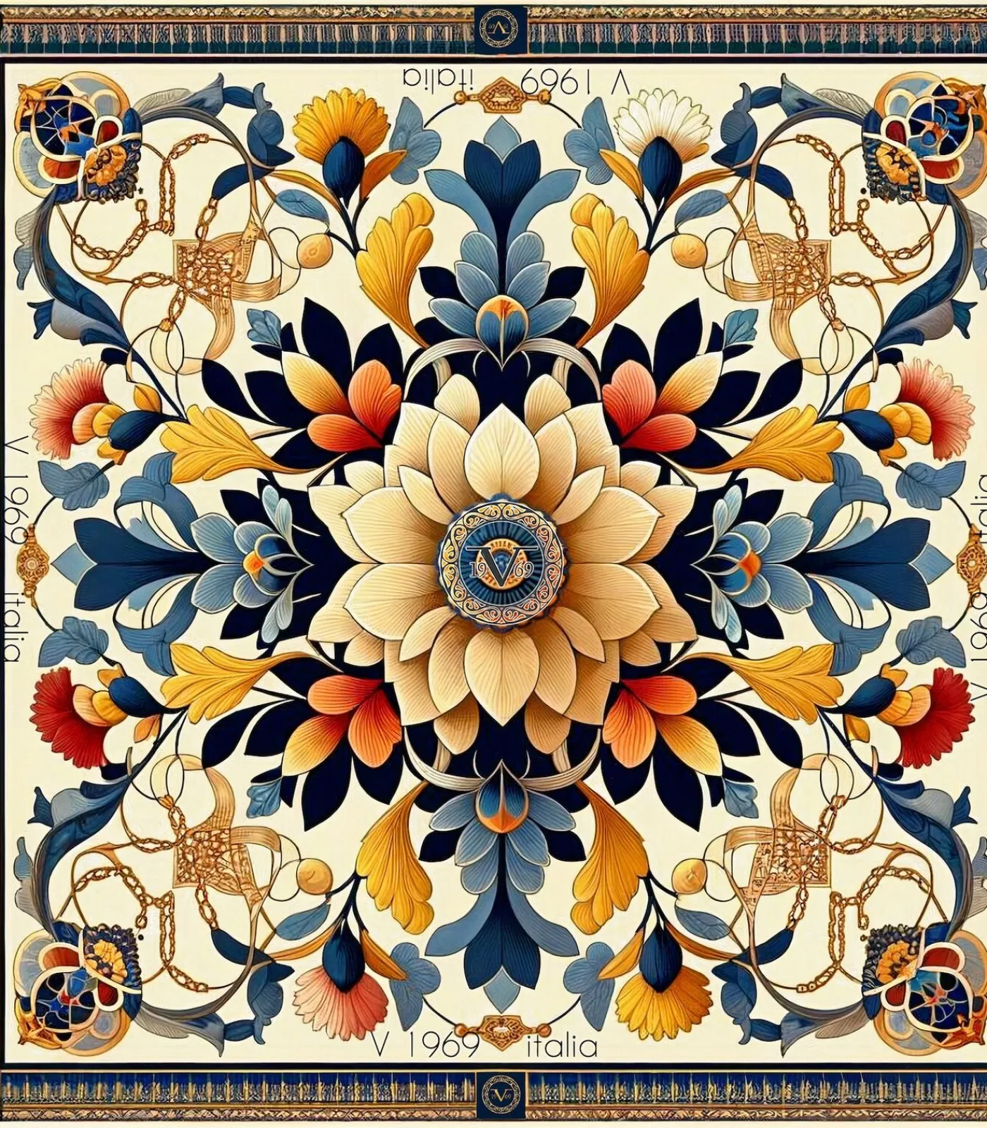 Beschrijving: Deze Royal Flowers zijden carré is een waar kunstwerk, dat een rijk en symmetrisch bloemig mandala verheerlijkt dat gratie en elegantie belichaamt. Gemaakt van 100% zijde, benadrukt deze sjaal van V1969 Italia gedetailleerde bloemmotieven omlijst door sierlijke randen, en weerspiegelt een erfgoed van luxe en verfijning. Met zijn afmetingen van 70×70 cm biedt het een explosie van levendige kleuren en harmonieuze vormen, ideaal om elke outfit met verfijning te verfraaien.Samenvatting:Afmetingen: 70×70 cmMateriaal: 100% zijdeMotief: Bloemen en symmetrische motievenOverheersende kleur: Blauw, goud en roodMerk: V1969 ItaliaCadeaupakket: Geleverd in een luxe bedrukte zak, klaar om cadeau te doen.