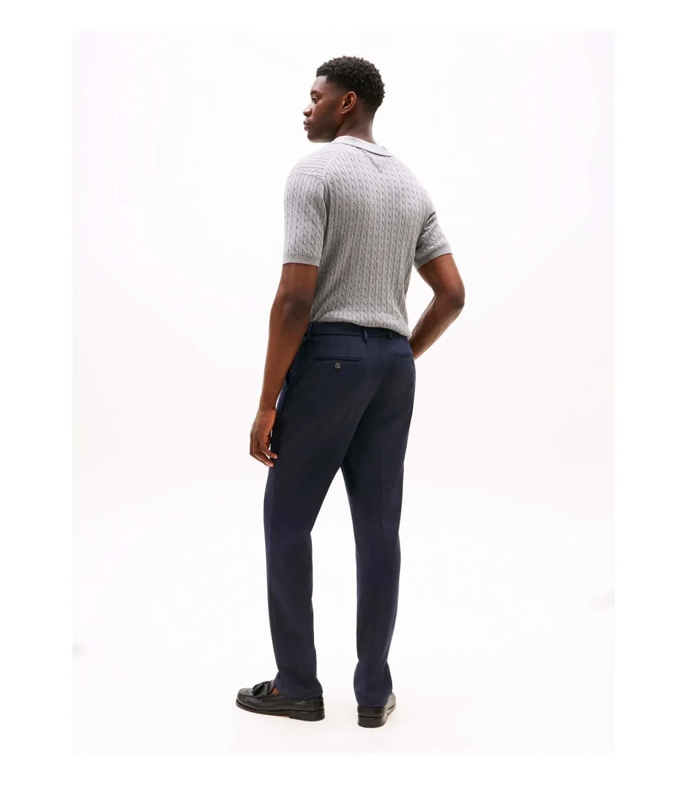 Kleur: marineblauw. Samenstelling: 75% polyester, 22% viscose, 3% elastaan. Pasvorm: recht model. Sluiting: rits en knoop. Details: twee open steekzakken, twee paspelzakken met knoop aan de achterkant, stretchstof van viscosemix, Tommy Hilfiger–merk. Duurzaamheid: gemaakt van gecertificeerd gerecycled polyester. Gebruik: ideaal voor praktische en elegante kleding, perfect voor op kantoor of voor smart casual gelegenheden.