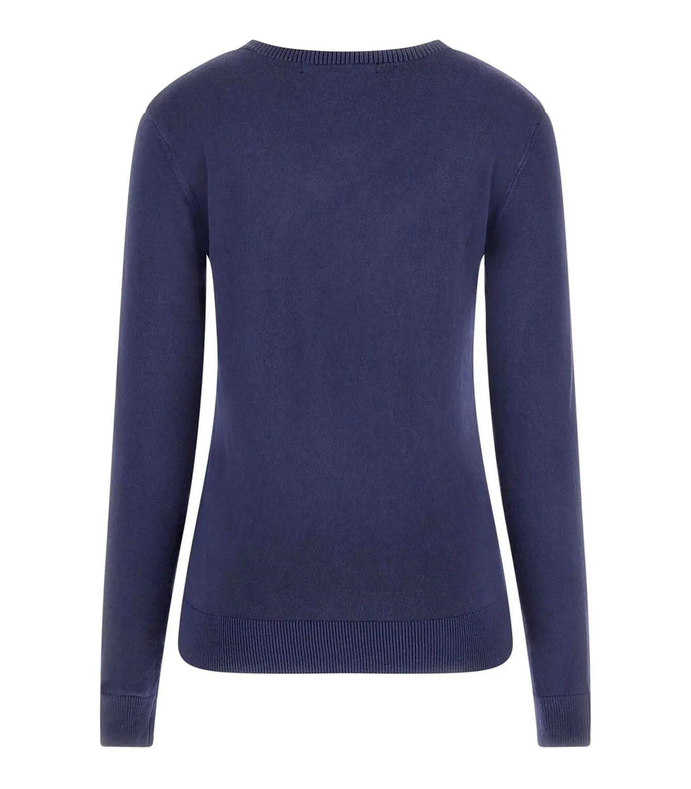 Kleur: Suiting Blue Samenstelling: 82% Viscose, 16% Polyamide, 2% Elastaan Mouwen: Lang Halslijn: Ronde hals Lengte: Regular Fit: Regular Fit Details: Trui van geverfd garen met logo–opschrift, gladde afwerking en geribbelde afwerkingen aan de hals, manchetten en zoom Gebruik: Ideaal te combineren met zowel casual looks als elegantere outfits
