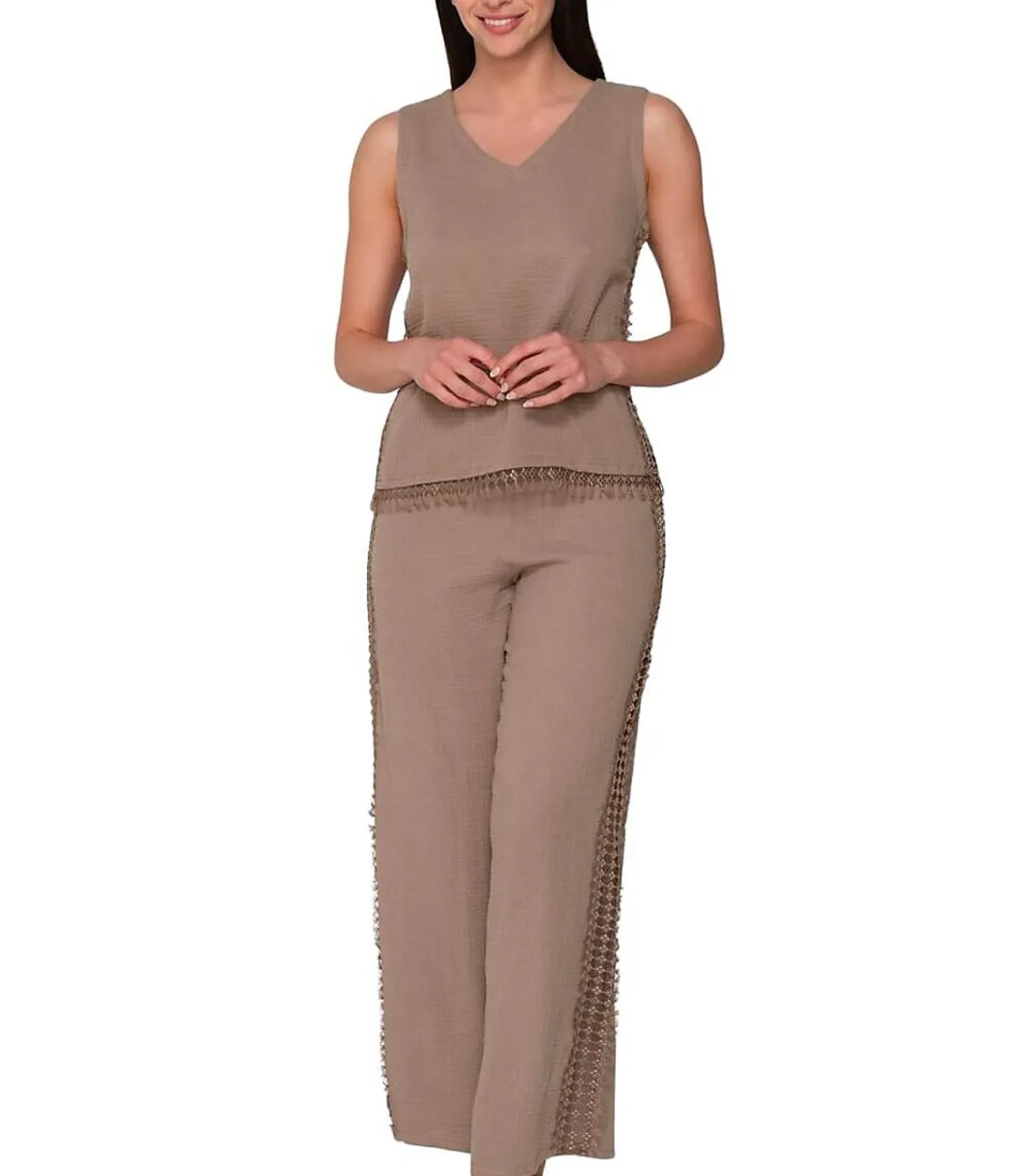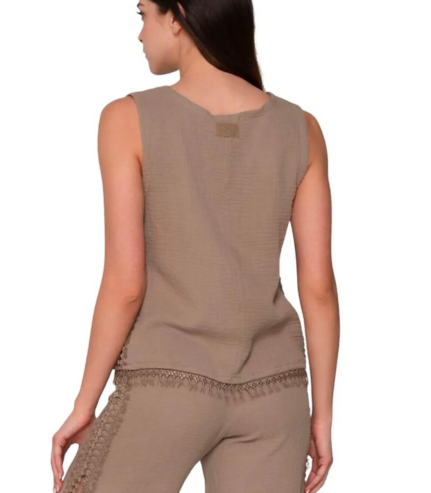 Deze mouwloze top is gemaakt van een lichtgewicht katoenen stof met een reliëfstructuur. Het heeft een eenvoudige, elegante V–halslijn. De zijkanten en zoom zijn versierd met delicate macramédetails die een vleugje verfijning en vrouwelijkheid aan het ensemble toevoegen. De stijl is zowel casual als chic, perfect voor zomerse dagen.[Top apart verkrijgbaar. Het broekje, de sieraden en andere accessoires die het model op de foto’s draagt, zijn niet inbegrepen].