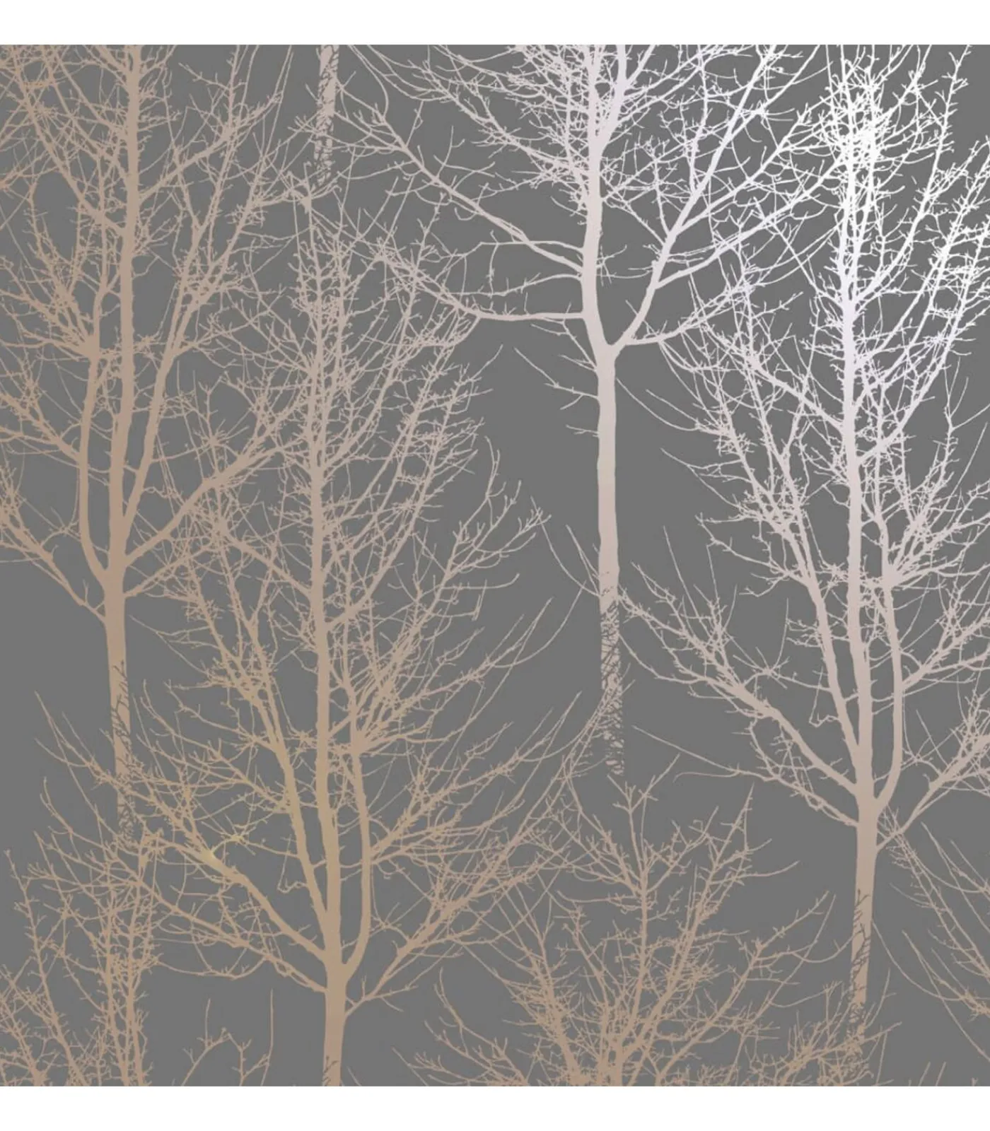 Dit duurzame behang heeft een op de natuur geïnspireerd motief in grijs en roségoud, is scheurvast en kan worden verwijderd met een verwijderingsmiddel of behangstomer zonder je muur te beschadigen.