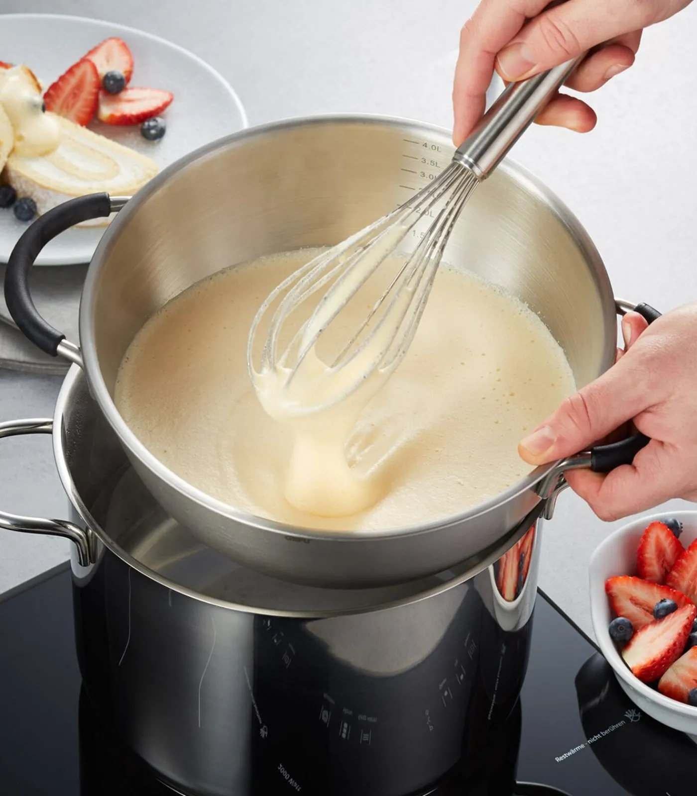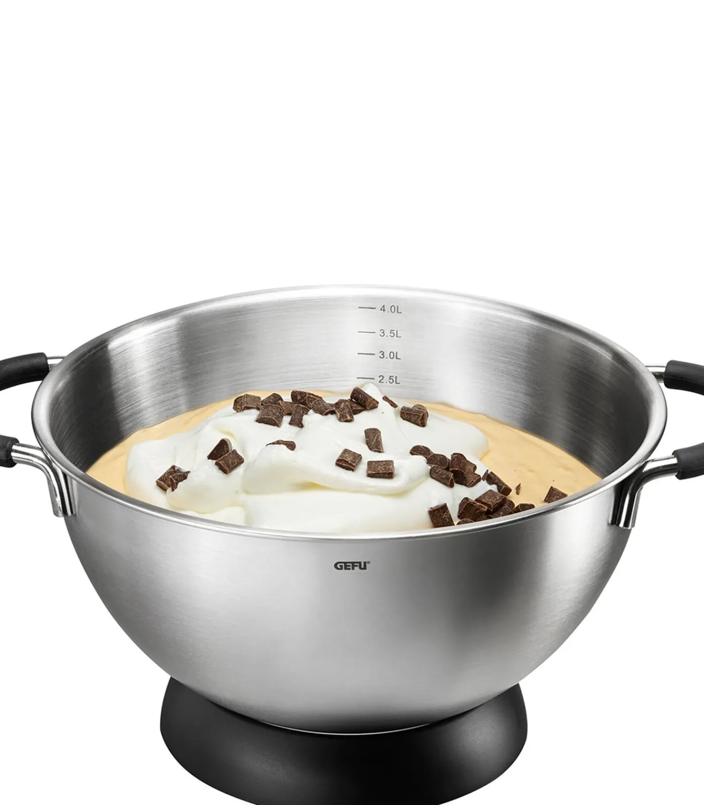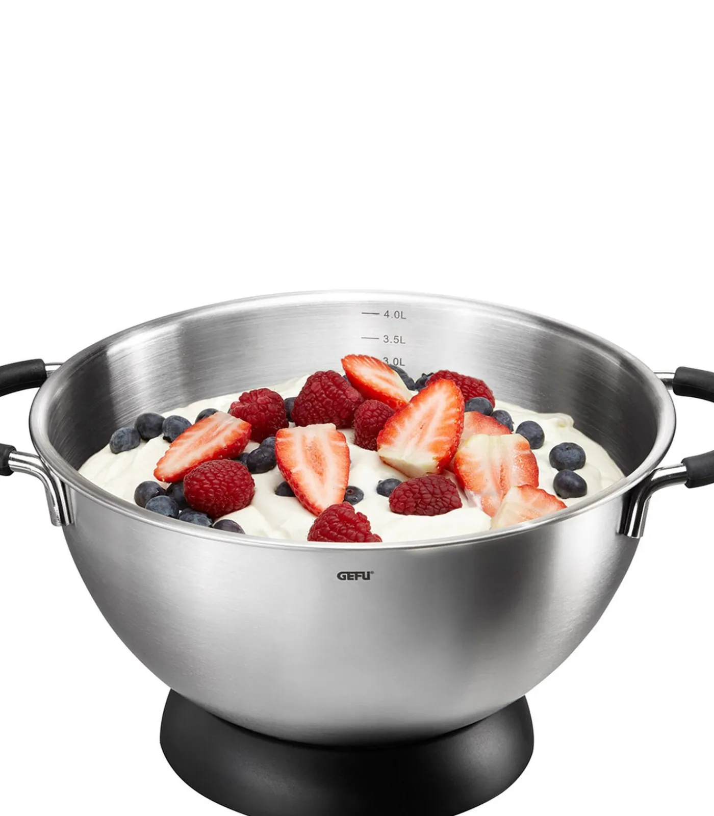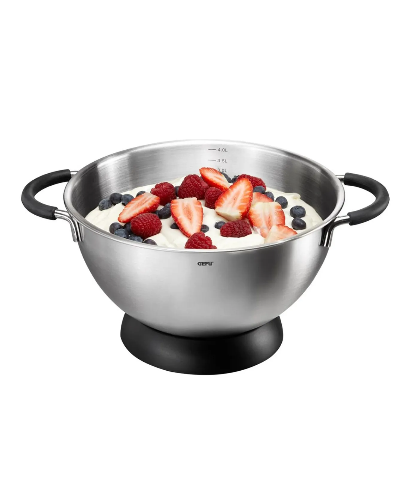 • vulvolume 4 l• handige, slipvrije handgrepen van silicone• praktische maatverdeling aan de binnenzijde• kom: Ø 24 cm, hoogte 14 cm• rond voetstuk: Ø 16 cm, hoogte 3 cm