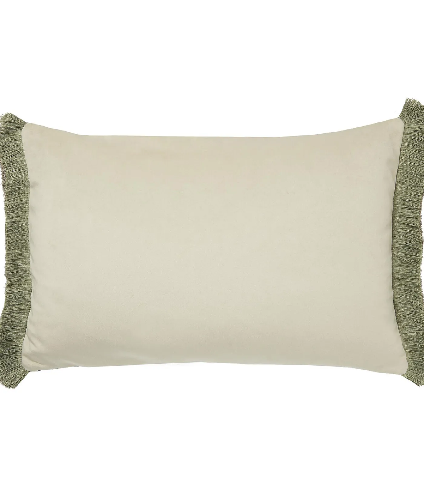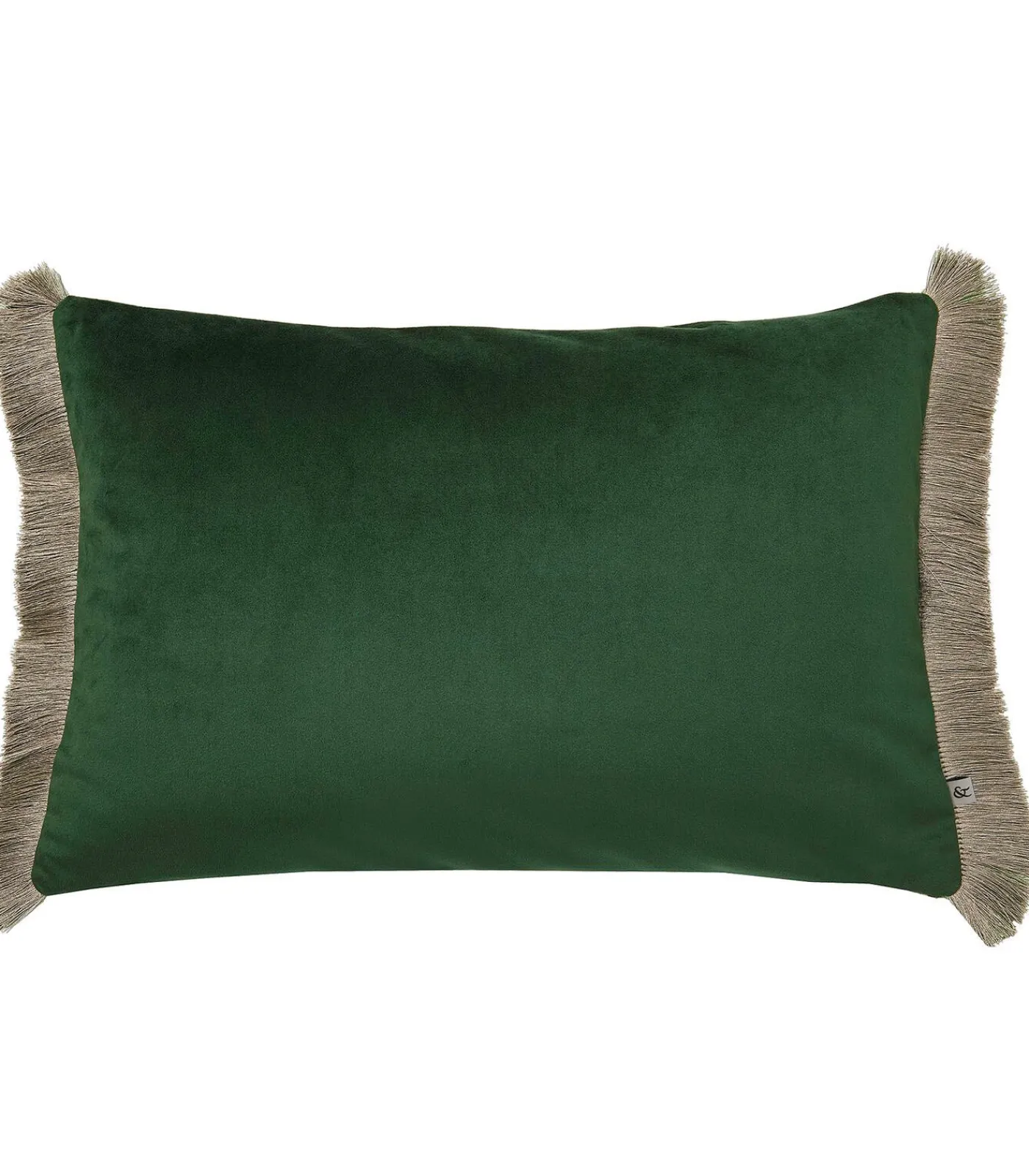 Het diepgroene fluweel, de elegante franjes en de zachtbeige achterzijde van dit kussen geven je interieur net dat vleugje kleur.