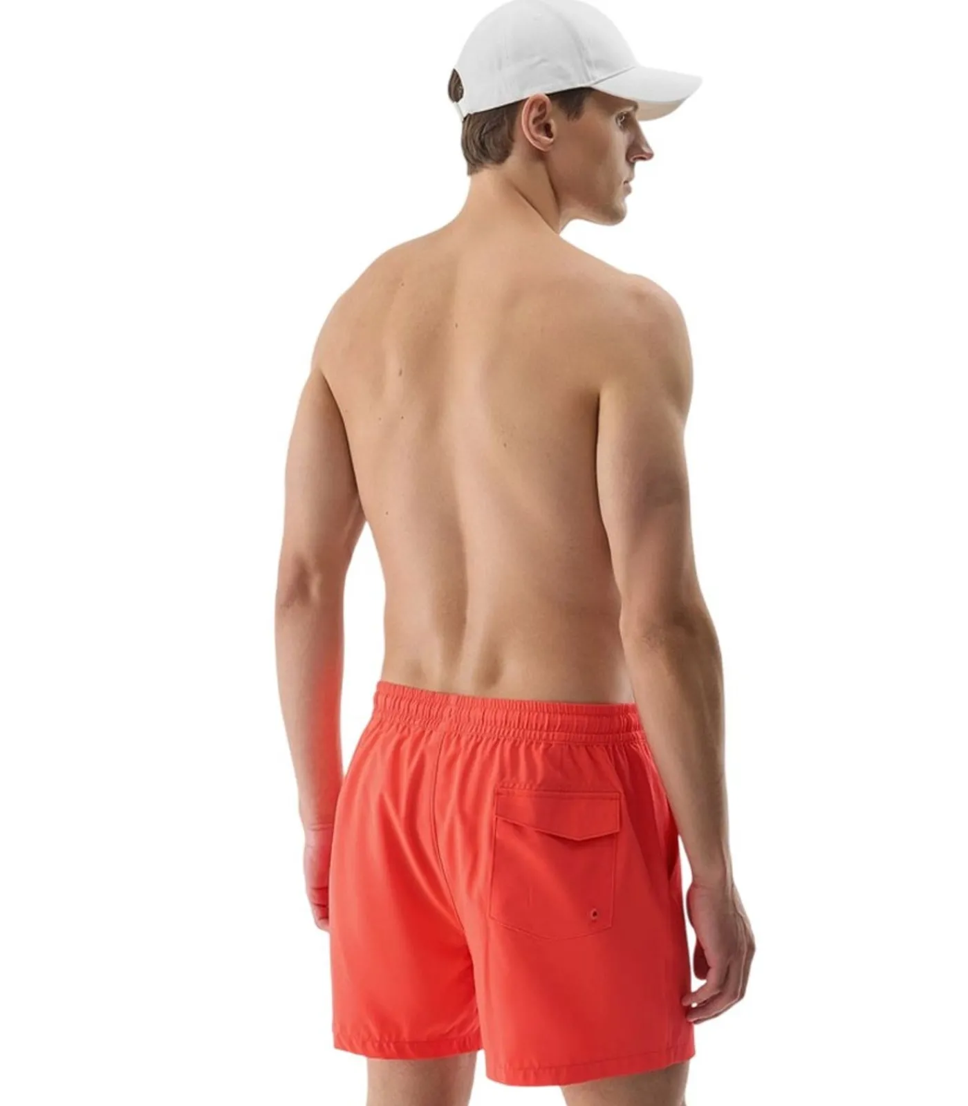 Zwembroek 4F M085 met een aangrijpend oranje uiterlijk is gemaakt van stevig polyester materiaal. Dit eenvoudige ontwerp heeft twee zijzakken en wordt vastgemaakt door een trek aan de achterkant. De tailleband is vervaardigd uit elastisch koord voor een goed passend gevoel.