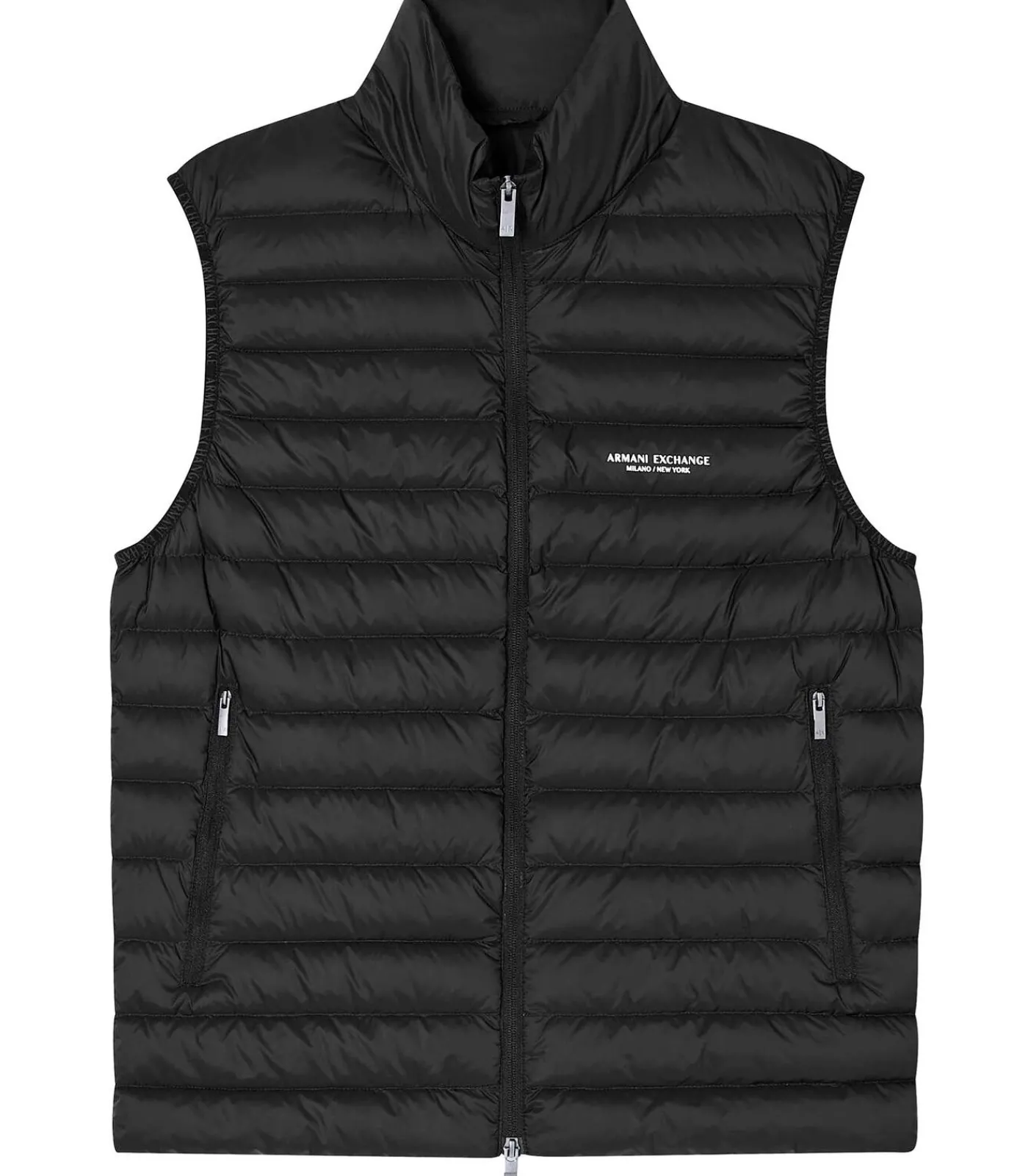 Kleur: Zwart Samenstelling: Buitenkant: 100% Polyamide; Vulling: 90% Witte eendendons, 10% Witte eendenveren; Voering: 100% Polyamide Pasvorm: Regular Fit Hals: Hoog Sluiting: Ritssluiting aan de voorkant Details: Mouwloos model, horizontale stiksels voor een gelijkmatige warmteverdeling, steekzakken met rits, Armani Exchange Milano / New York–logo in contrasterende opdruk op de borst Gebruik: Lichtgewicht en praktisch mouwloos donsjack voor heren, perfect voor het tussenseizoen en om urban looks met een dynamische touch af te ronden